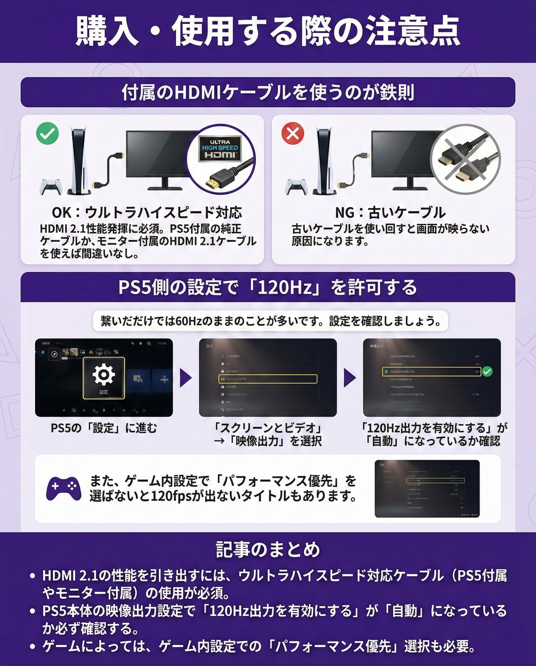 HDMI 2.1の性能を発揮するには、ケーブルも「ウルトラハイスピード」対応である必要があります。PS5に付属している純正ケーブルか、モニターに付属のHDMI 2.1ケーブルを使えば間違いありません。古いケーブルを使い回すと画面が映らない原因になります。