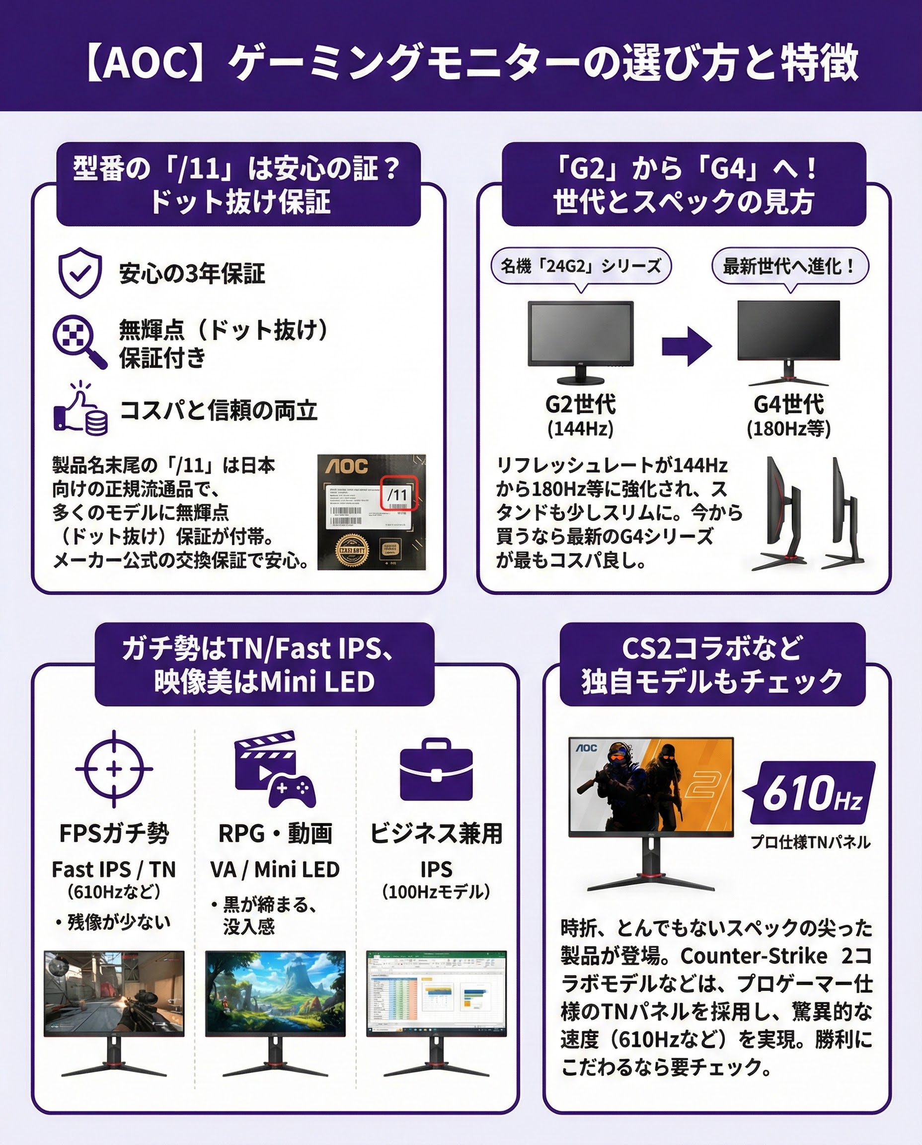 AOCの製品名末尾にある「/11」は、日本向けの正規流通品であることを示唆しており、多くのモデルに無輝点保証(ドット抜け保証)が付帯します。格安モニターで一番の不安要素である「画面のドット欠け」に対して、メーカー公式の交換保証があるのは大きな強みです。