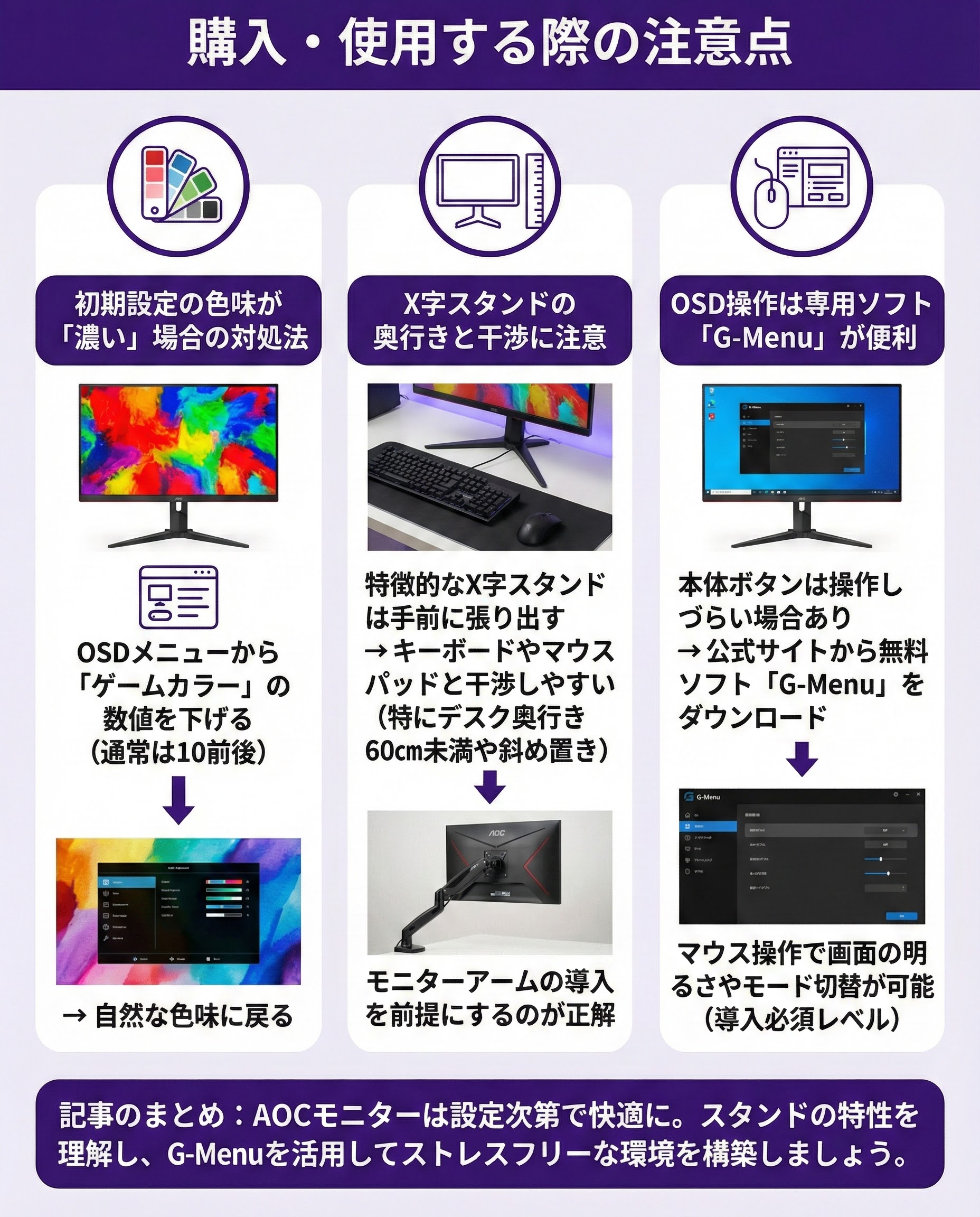 AOCのスタンドは鋭角に広がっているため、キーボードやマウスパッドと干渉しやすい傾向があります。デスクの奥行きが60cm未満の場合や、キーボードを斜め置きするスタイルの方は、モニターアームの導入を前提にするのが正解です。