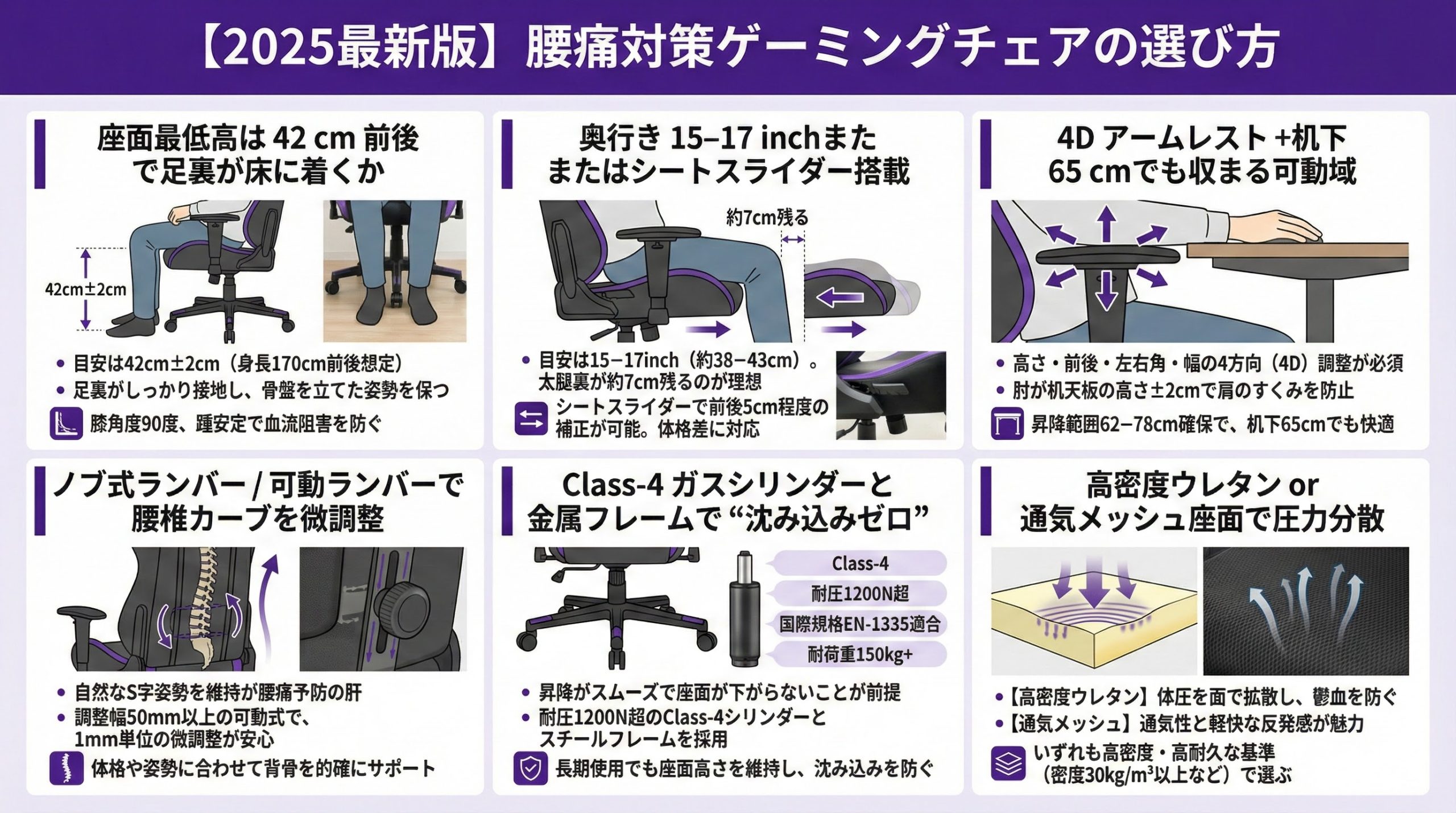 【2025最新版】腰痛対策ゲーミングチェアの選び方座面最低高は 42 cm 前後で足裏が床に着くか