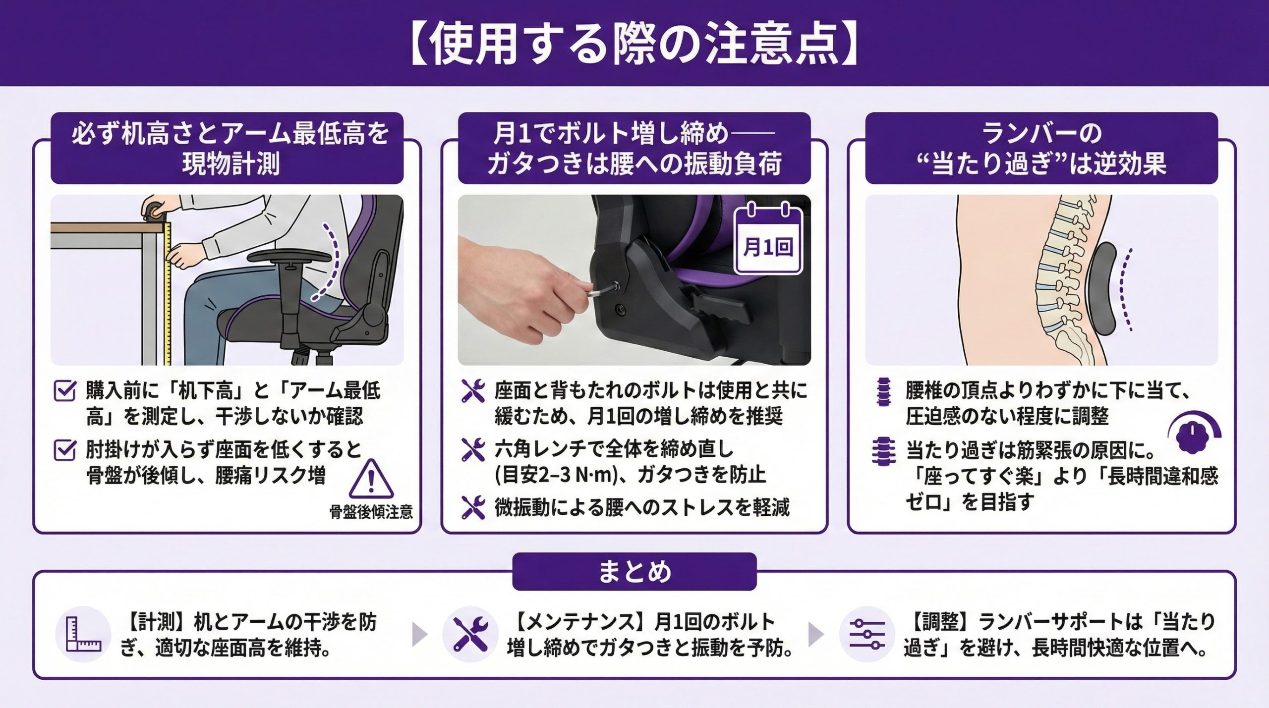 座面と背もたれを繋ぐボルトは使用と共に緩みます。月1回、六角レンチで全体を2–3 N·mで締め直すことでガタつきを防ぎ、腰への微振動ストレスを軽減します。