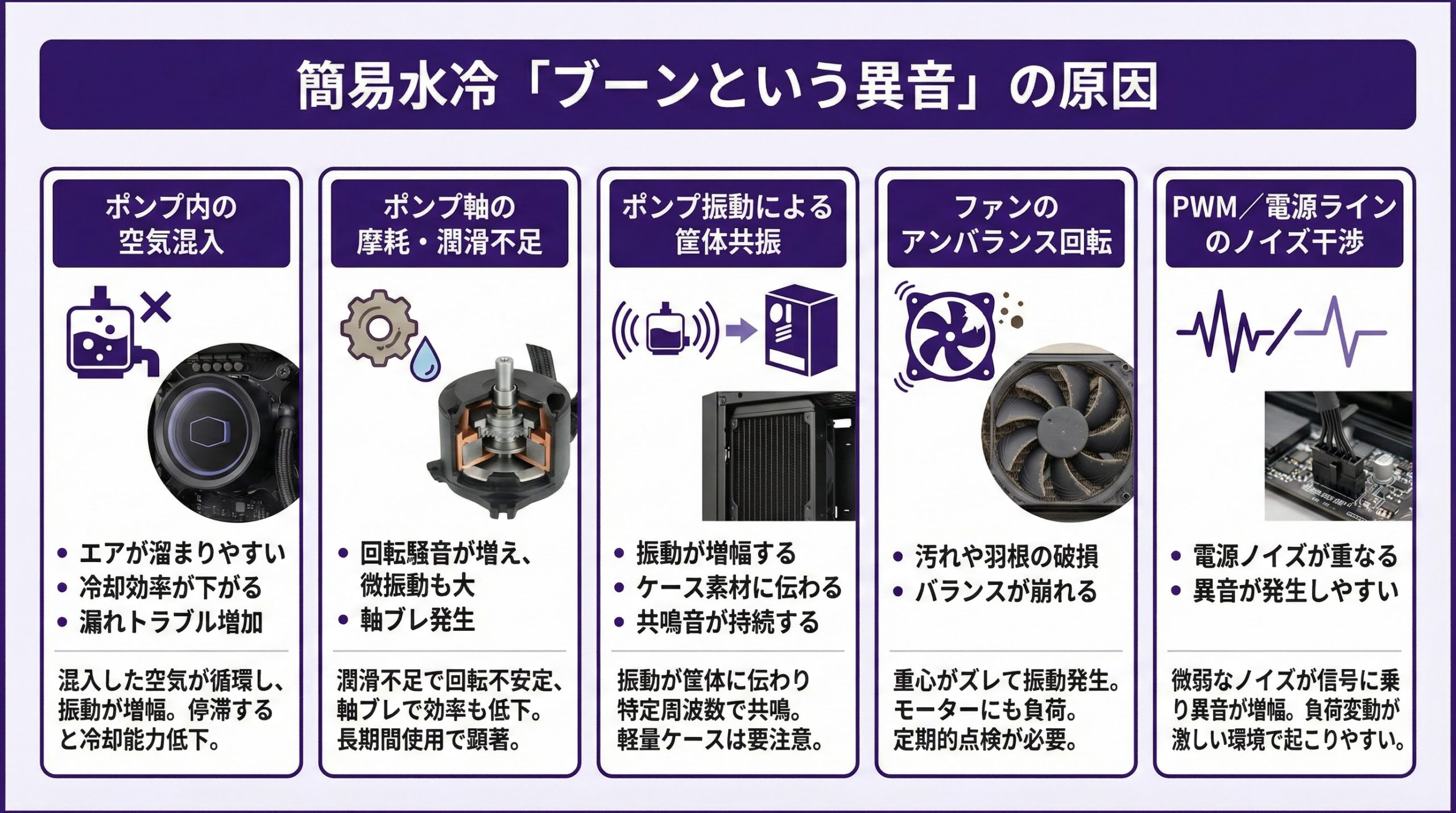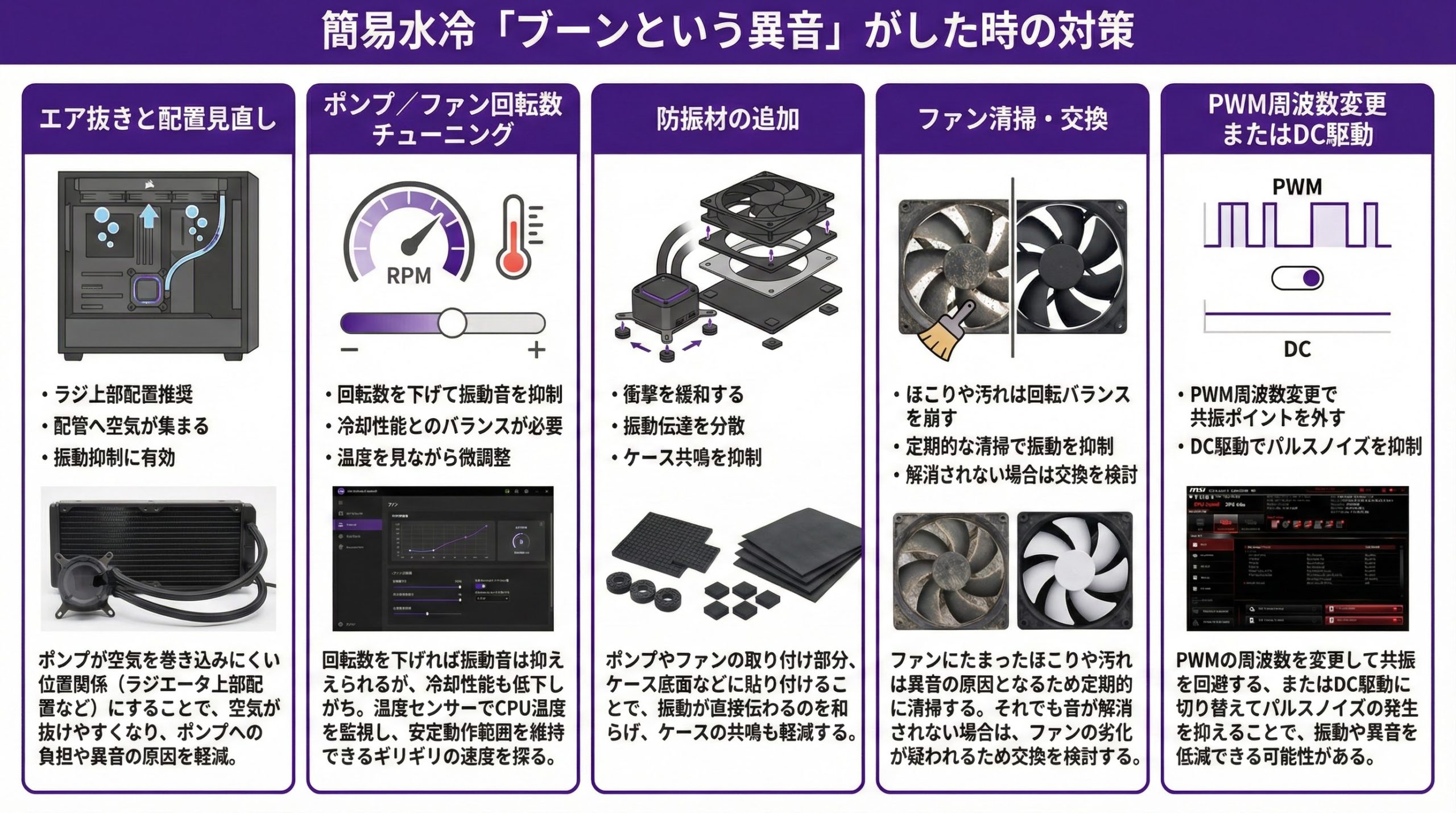 簡易水冷クーラーは高い冷却性能と静音性を両立できる魅力的な選択肢です。しかし「ブーン」という異音が発生したら、原因を絞り込んで早めに対処することが快適なPCライフへの近道となります。