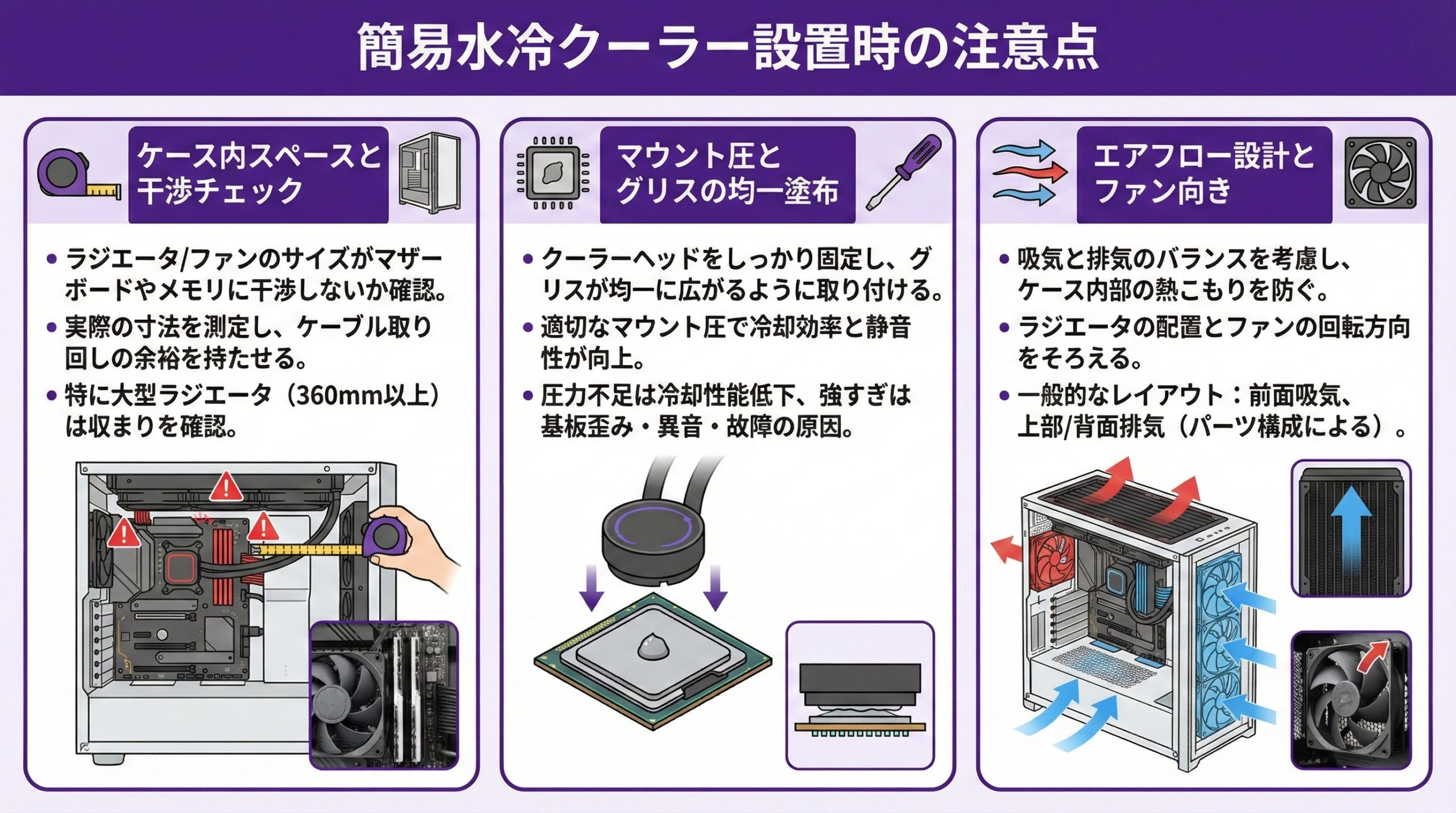 ラジエータやファンのサイズによっては、マザーボードやメモリに干渉する場合があります。実際の寸法を測り、ケーブル類との取り回しにも余裕を持たせましょう。特に360 mm以上の大型ラジエータはケース上部や前面などにしっかり収まるか確認が必要です。追加のケースファン枠も確認してください。