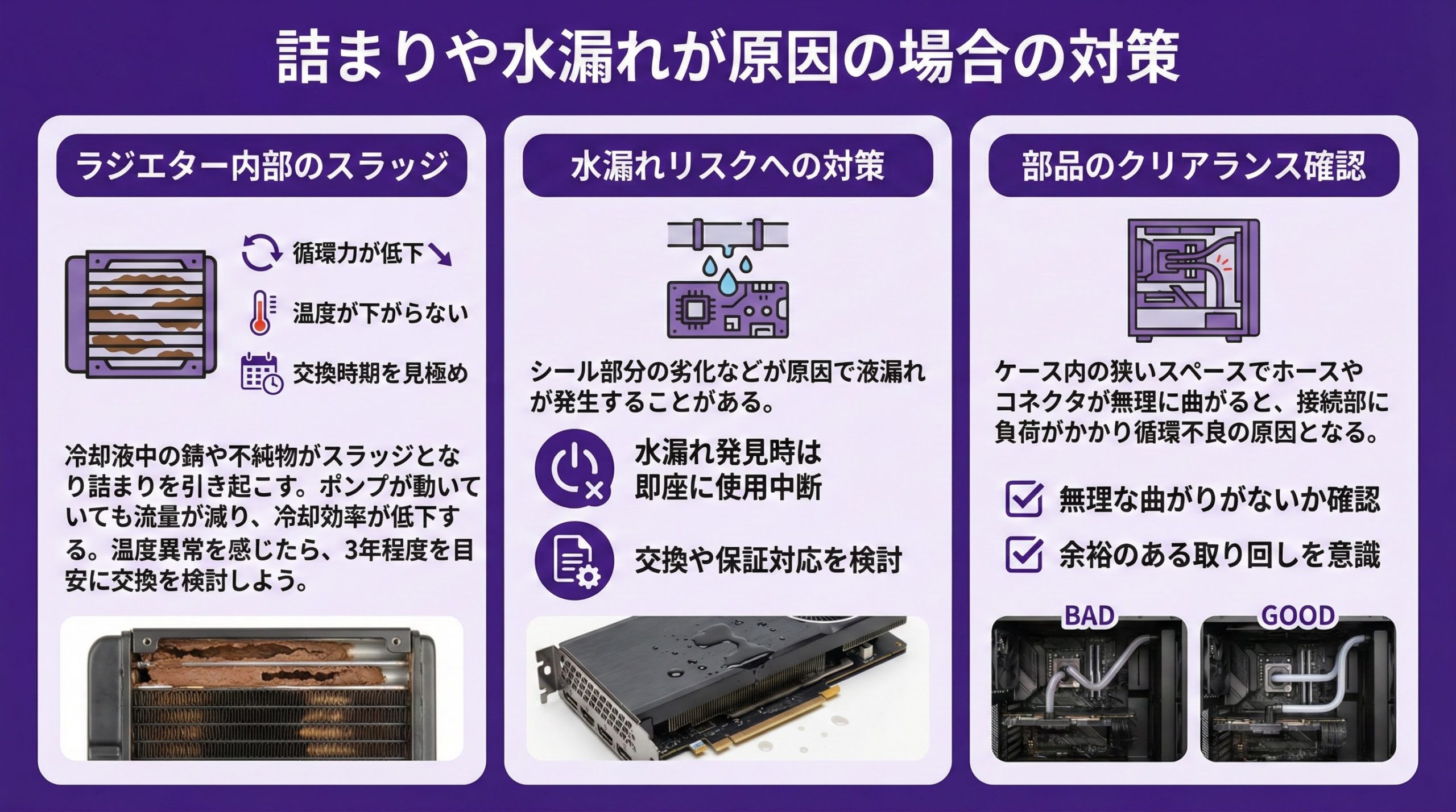 冷却液の中で微細な錆や不純物が生じると、ラジエター内部でスラッジ詰まりを起こします。するとポンプが回っていても流量が減り、CPU温度が下がりにくくなります。