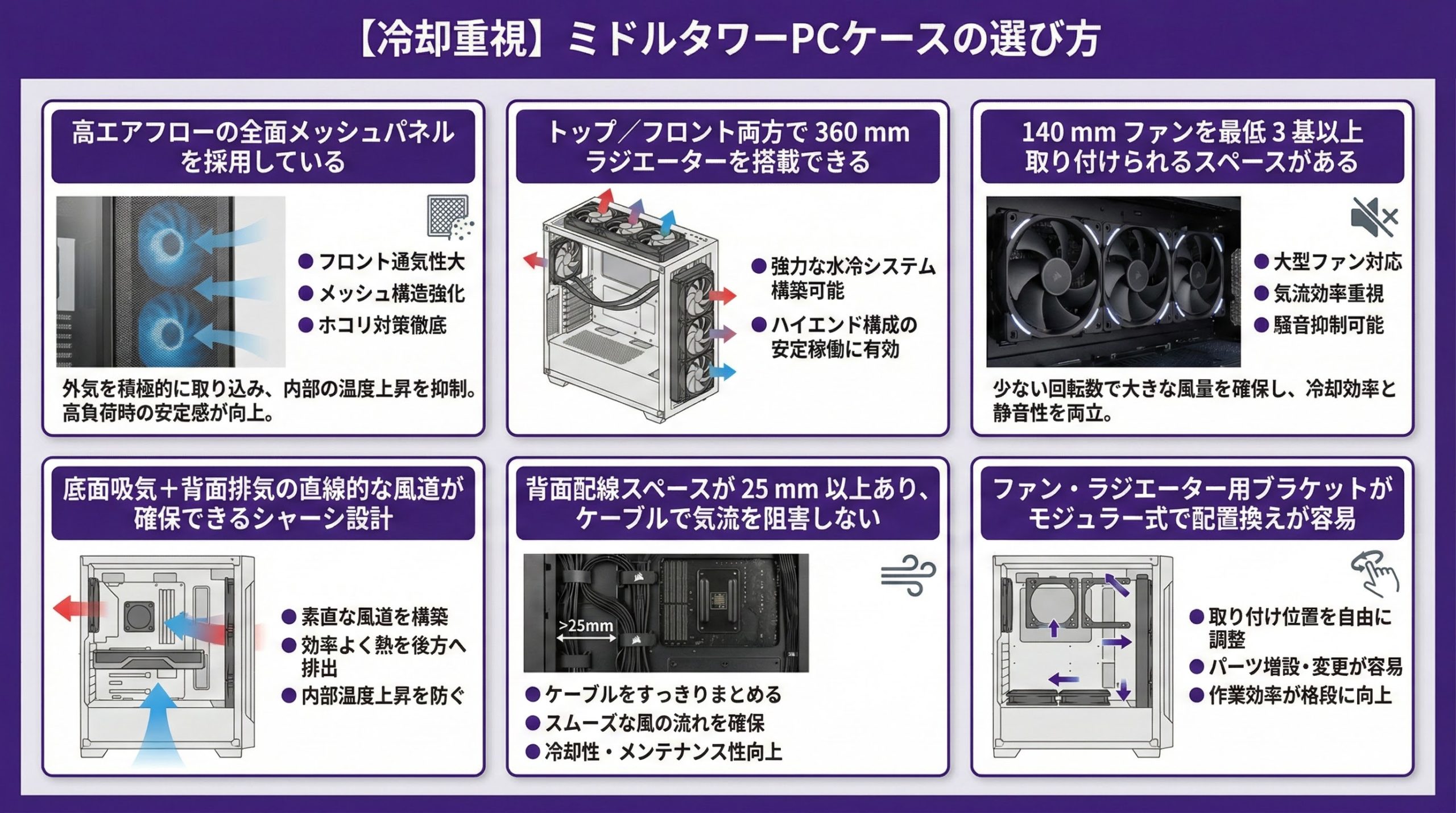 冷却を重視したミドルタワーPCケースは、高性能パーツの熱を効率よく逃がしながら動作を安定させる重要な要素です。ここでは、選び方のポイントや設置時の注意点を踏まえて、わかりやすく解説します。