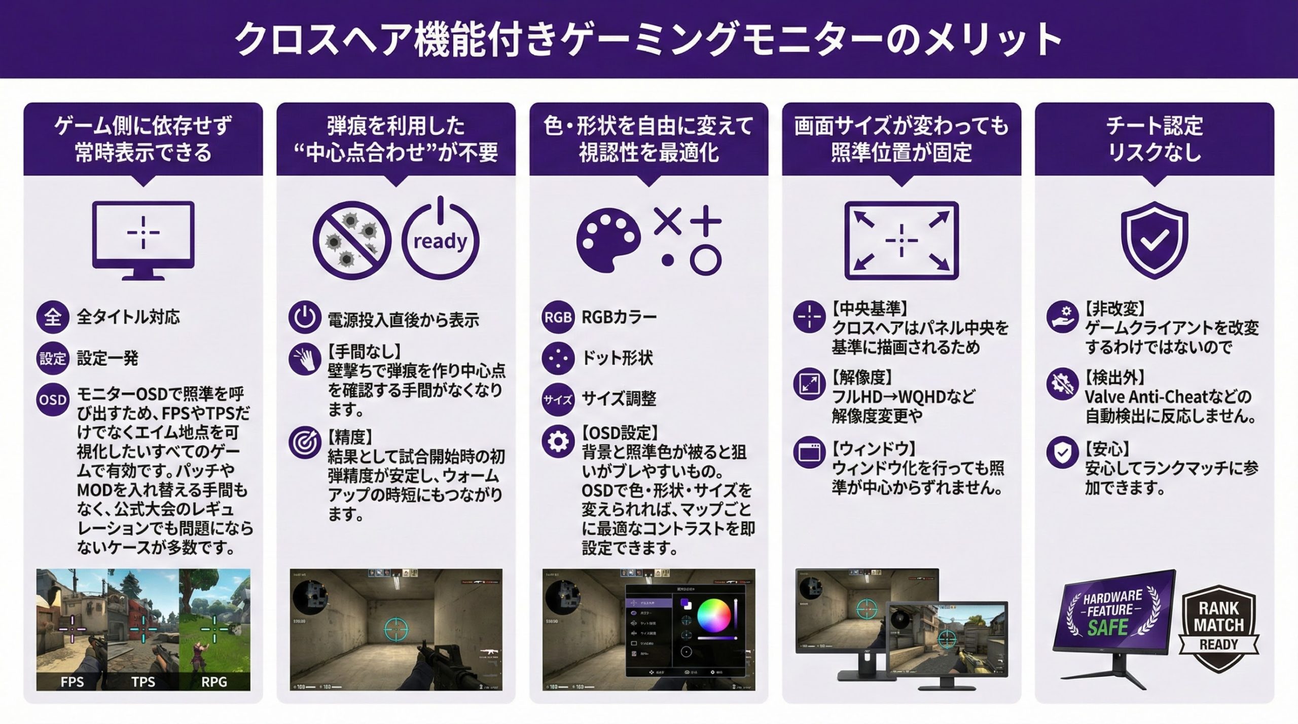 モニターOSDで照準を呼び出すため、FPSやTPSだけでなくエイム地点を可視化したいすべてのゲームで有効です。パッチやMODを入れ替える手間もなく、公式大会のレギュレーションでも問題にならないケースが多数です。
