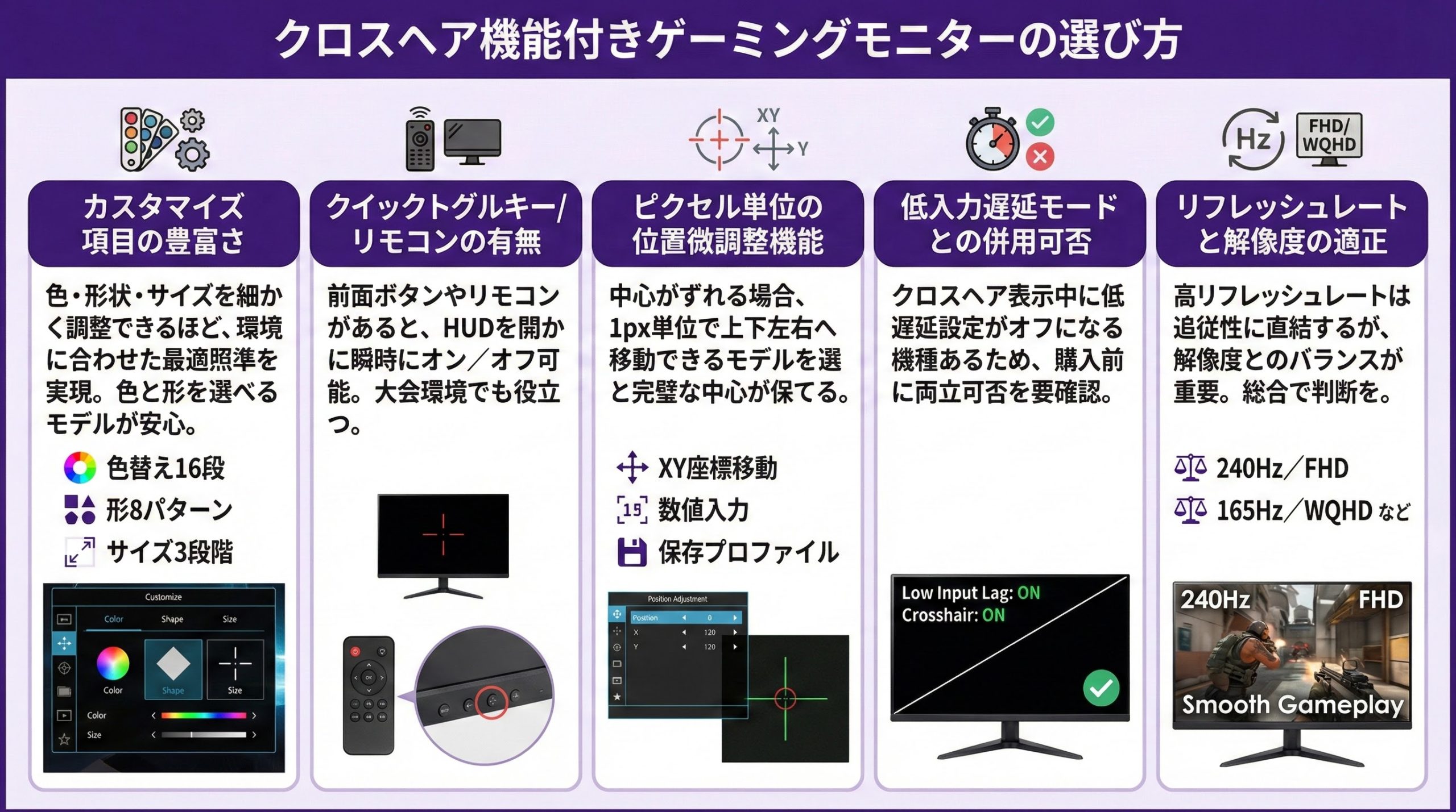 クロスヘア表示中に「インスタントモード」などの低遅延設定がオフになる機種もあります。購入前に両立可否を要確認。