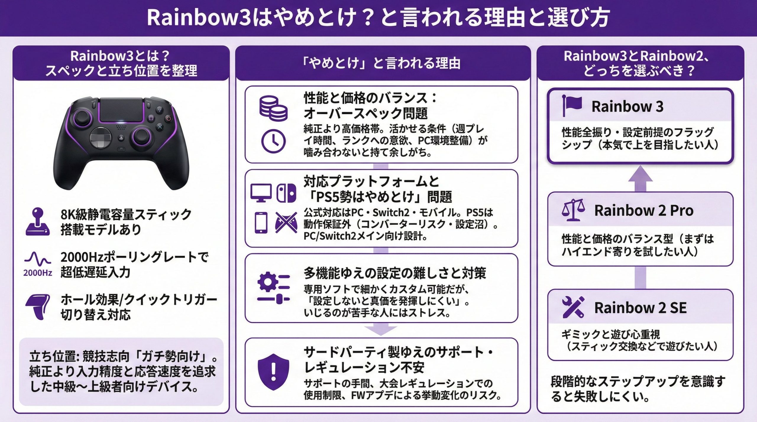 「Rainbow3はやめとけって聞くけど、本当に買わない方がいいの?」と悩んでいませんか? Rainbow 3は8K級静電容量スティックや2000Hzポーリングレートなどを搭載したガチ勢向けハイエンドコントローラーです。そのぶん、価格や設定の手間、対応プラットフォームなど、人を選ぶ要素も多めです。