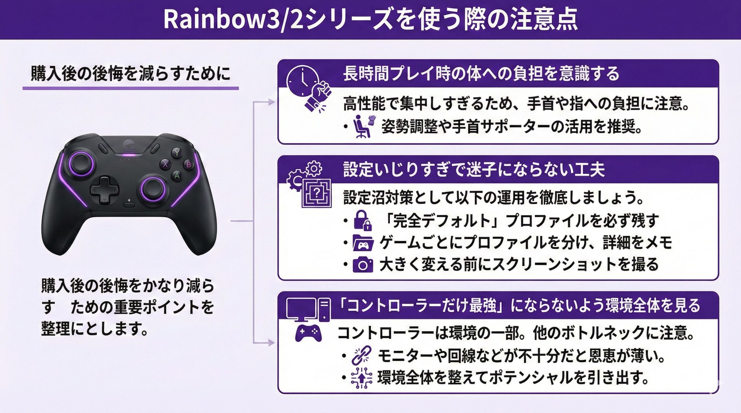 Rainbow3/2シリーズを使う際の注意点最後に、「Rainbow3はやめとけ」と言われがちなポイントを踏まえつつ、実際にRainbow3シリーズを使っていくうえで気をつけたい点を整理します。ここを押さえておけば、購入後の後悔をかなり減らせます。
