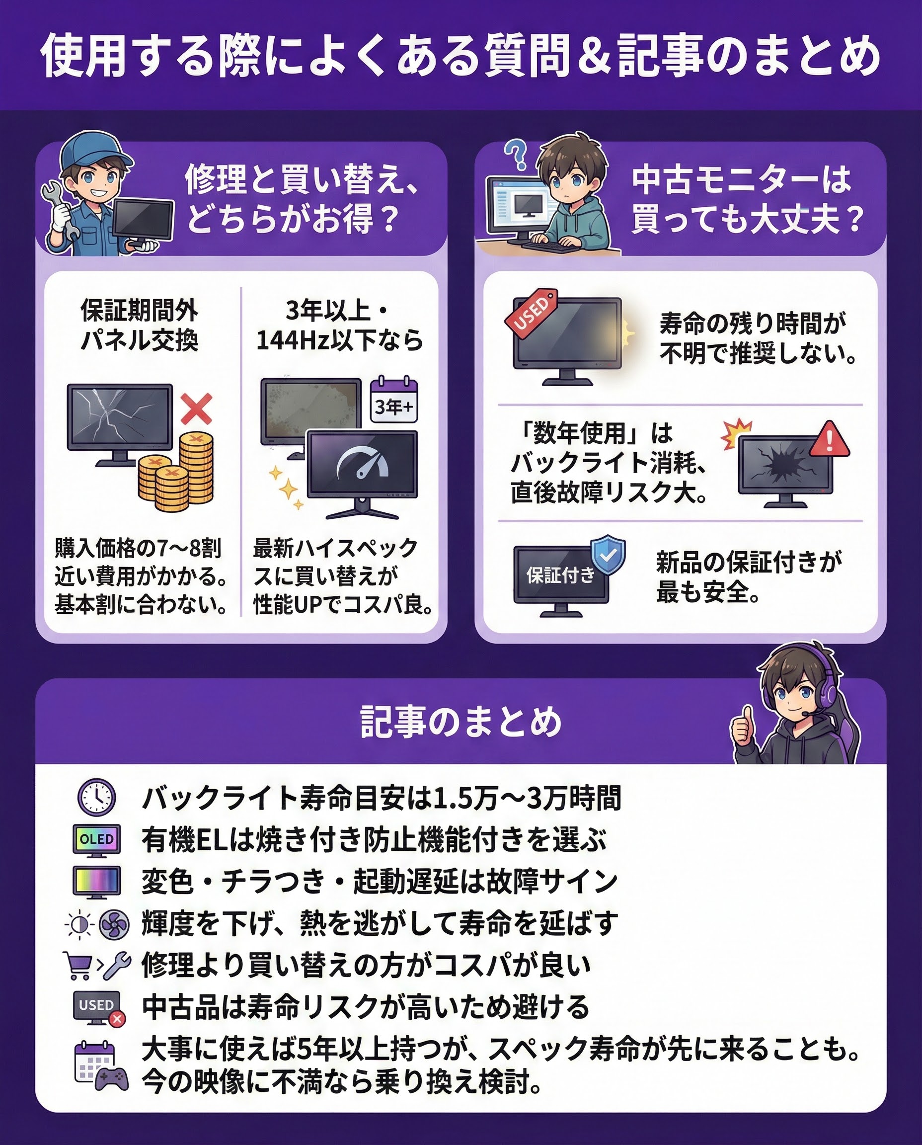 保証期間外のパネル交換は、購入価格の7〜8割近い費用がかかることが多く、基本的には割に合いません。「3年以上使った」「144Hz以下」なら、最新のハイスペックモニターに買い替えたほうが、性能も上がりコスパが良いです。