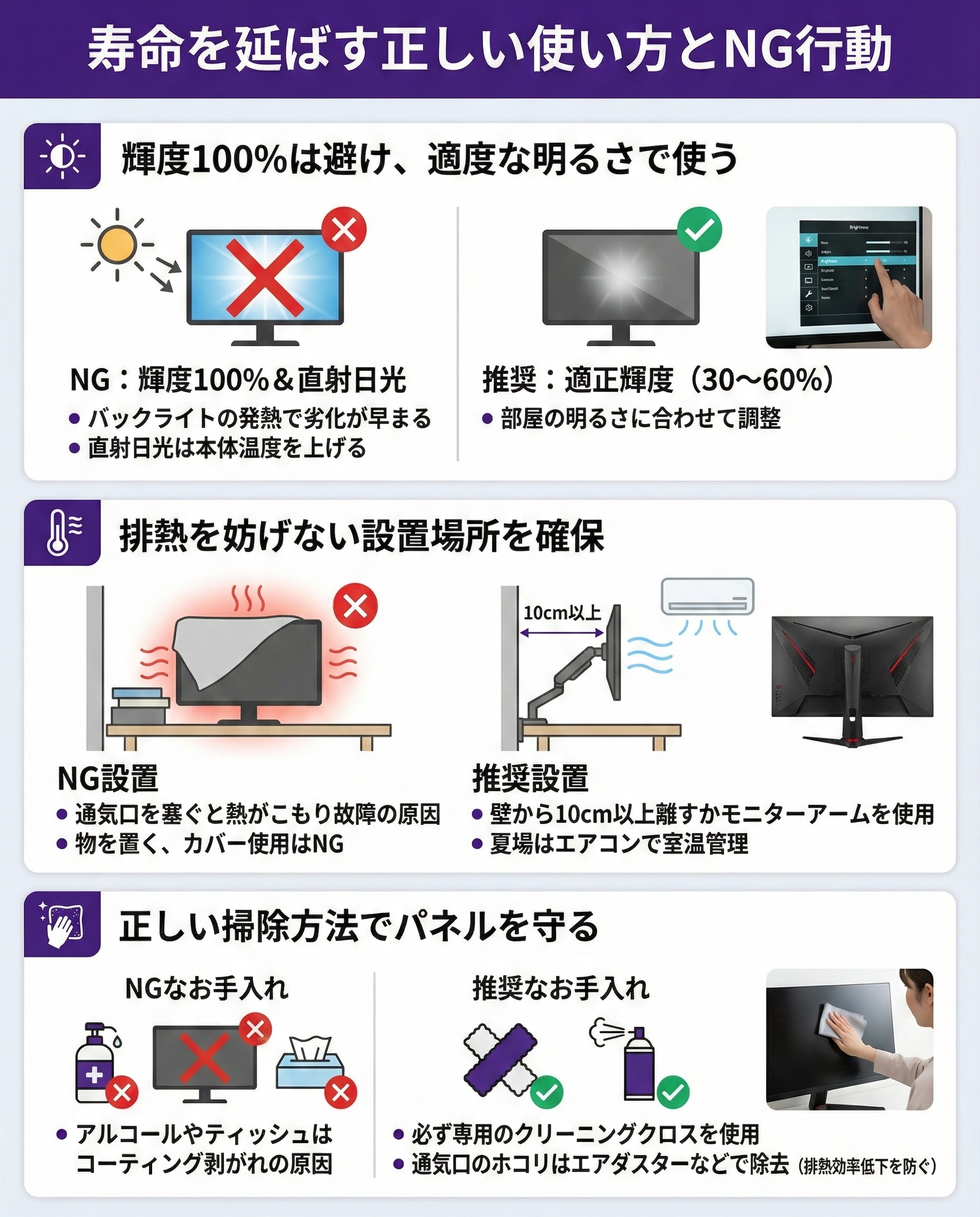 バックライトは明るくするほど発熱し、劣化が早まります。また、直射日光が当たる場所も本体温度を上げるためNGです。目の健康とモニター寿命の両方のために、部屋の明るさに合わせた適正輝度(通常は30〜60%程度)で使用しましょう。