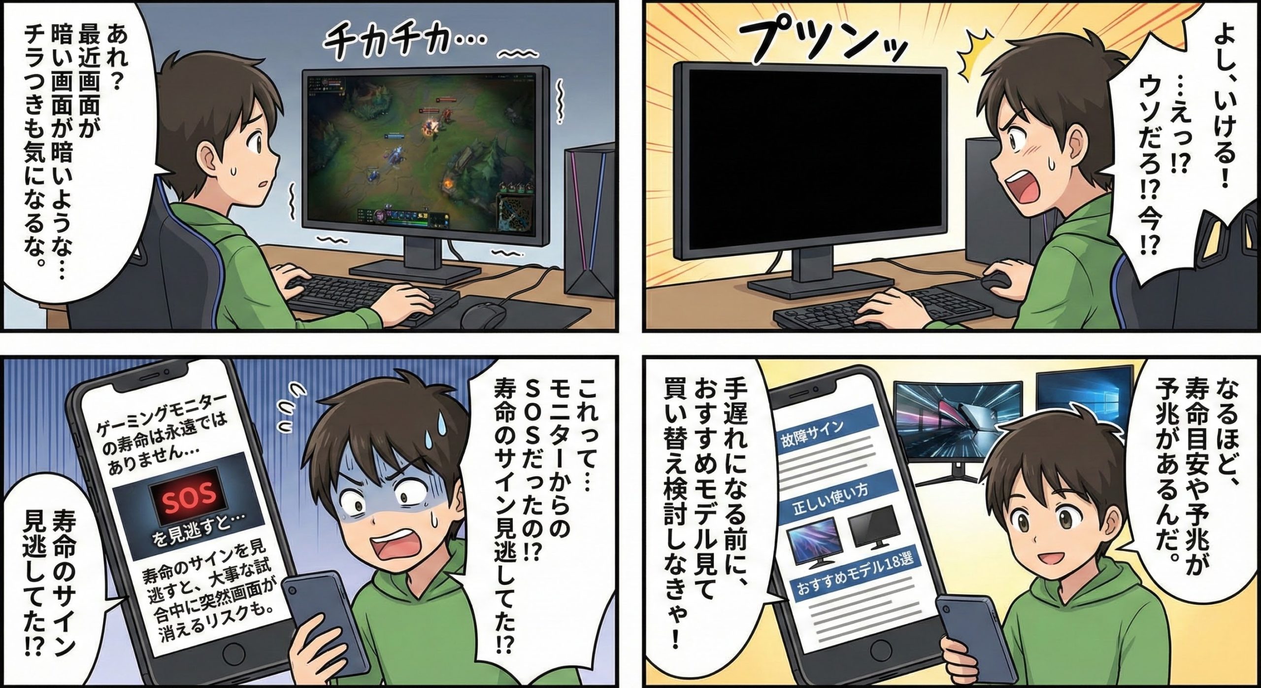 ゲーミングモニターの寿命は永遠ではありません。「最近画面が暗い」「チラつきが気になる」といった症状は、モニターからのSOSかもしれません。寿命のサインを見逃すと、大事な試合中に突然画面が消えるリスクも。この記事では、液晶や有機ELの寿命目安と予兆を解説し、買い替えに最適なおすすめモデル18選を紹介します。