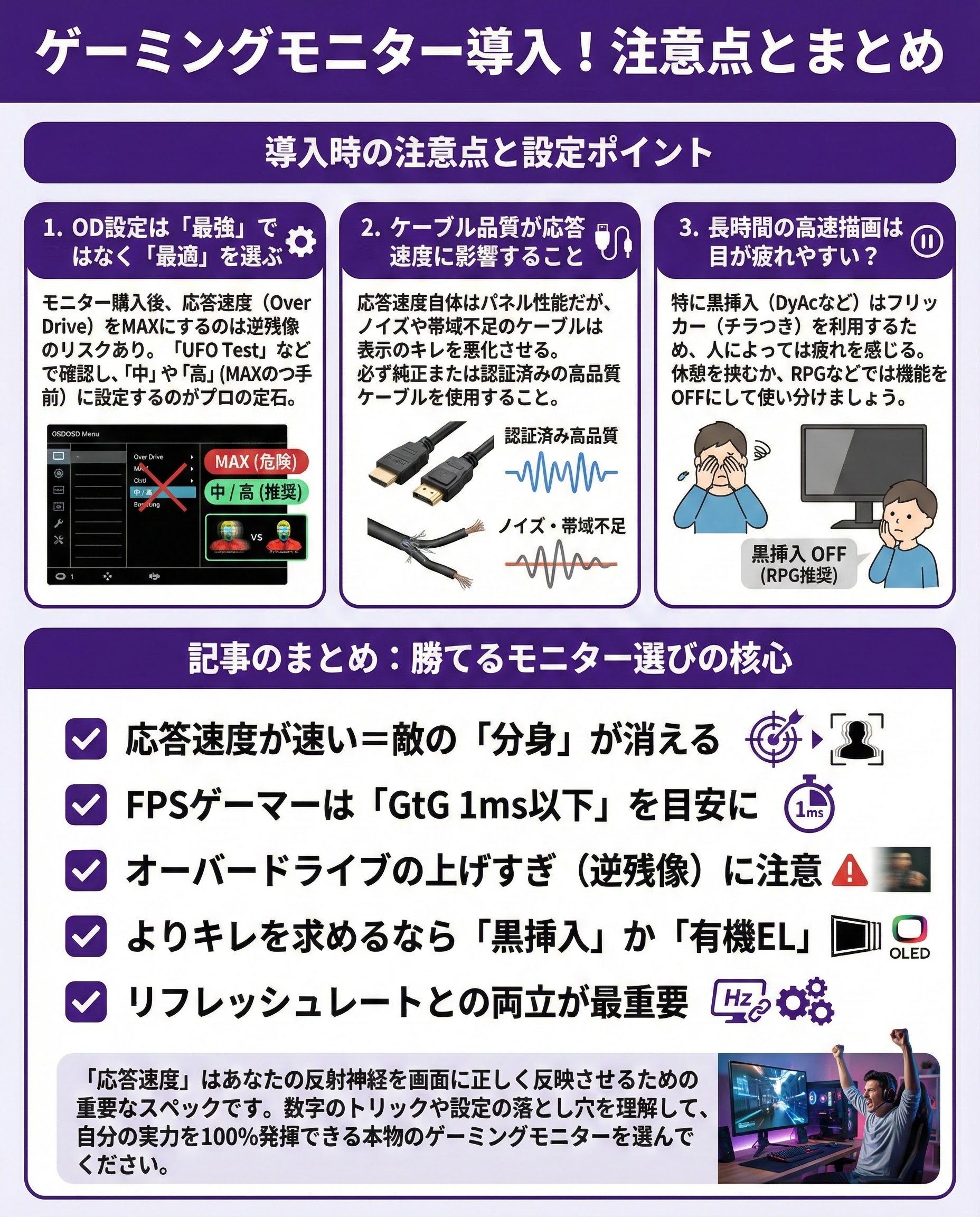「応答速度」は、あなたの反射神経を画面に正しく反映させるための重要なスペックです。数字のトリックや設定の落とし穴を理解して、自分の実力を100%発揮できる本物のゲーミングモニターを選んでください。