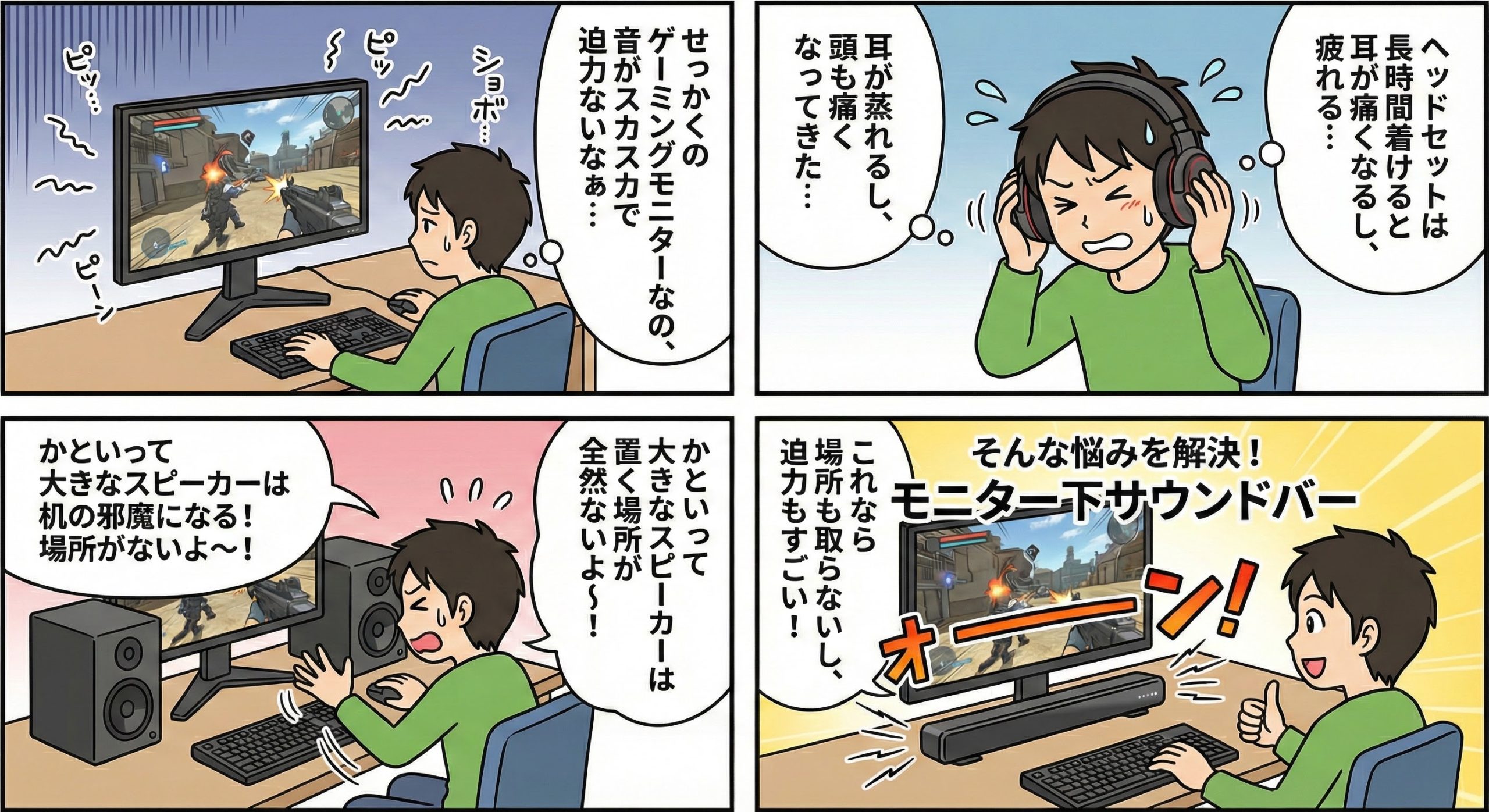 モニター用サウンドバーは、限られたデスクスペースで「音の迫力」と「快適さ」を手に入れる最良の手段です。ヘッドセットの圧迫感から解放され、より自由にゲームの世界に没入できる環境を作ってみてください。