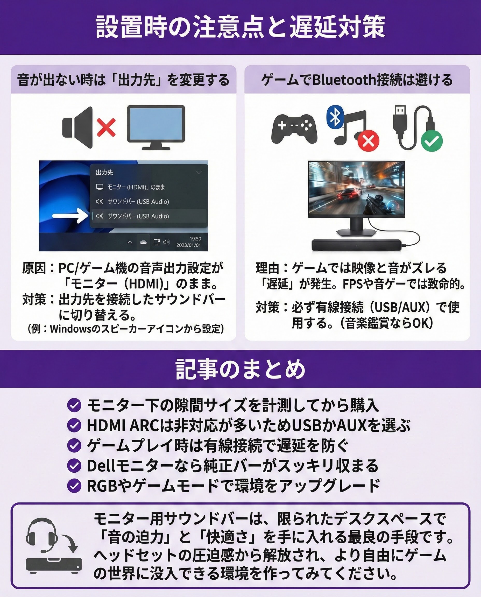 設置時の注意点と遅延対策音が出ない時は「出力先」を変更する