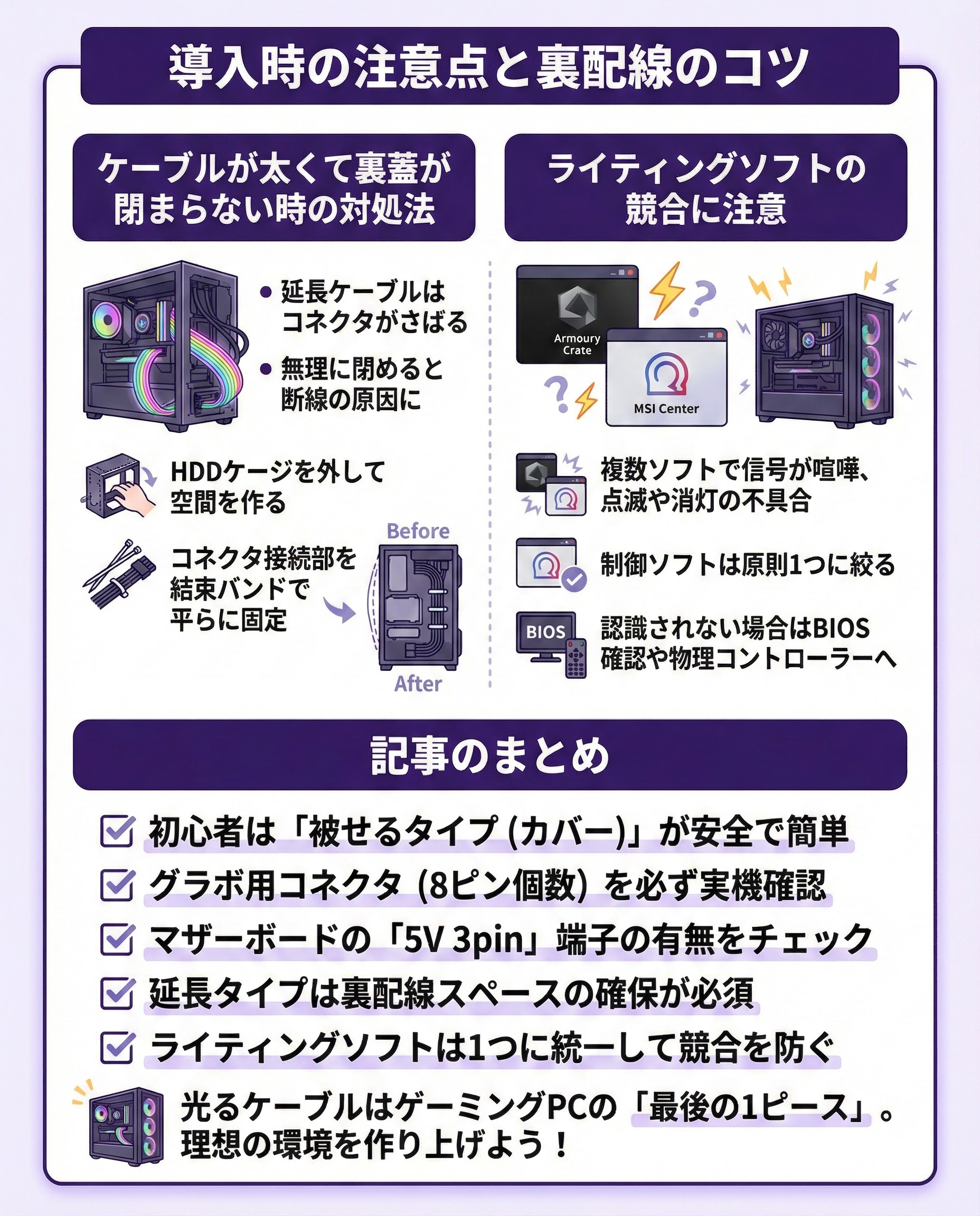 「Armoury Crate」や「MSI Center」など、制御ソフトは原則1つに絞りましょう。光るケーブルがうまく認識されない場合は、マザーボードのBIOSでRGB設定を確認するか、物理コントローラー(リモコン)での操作に切り替えると安定します。