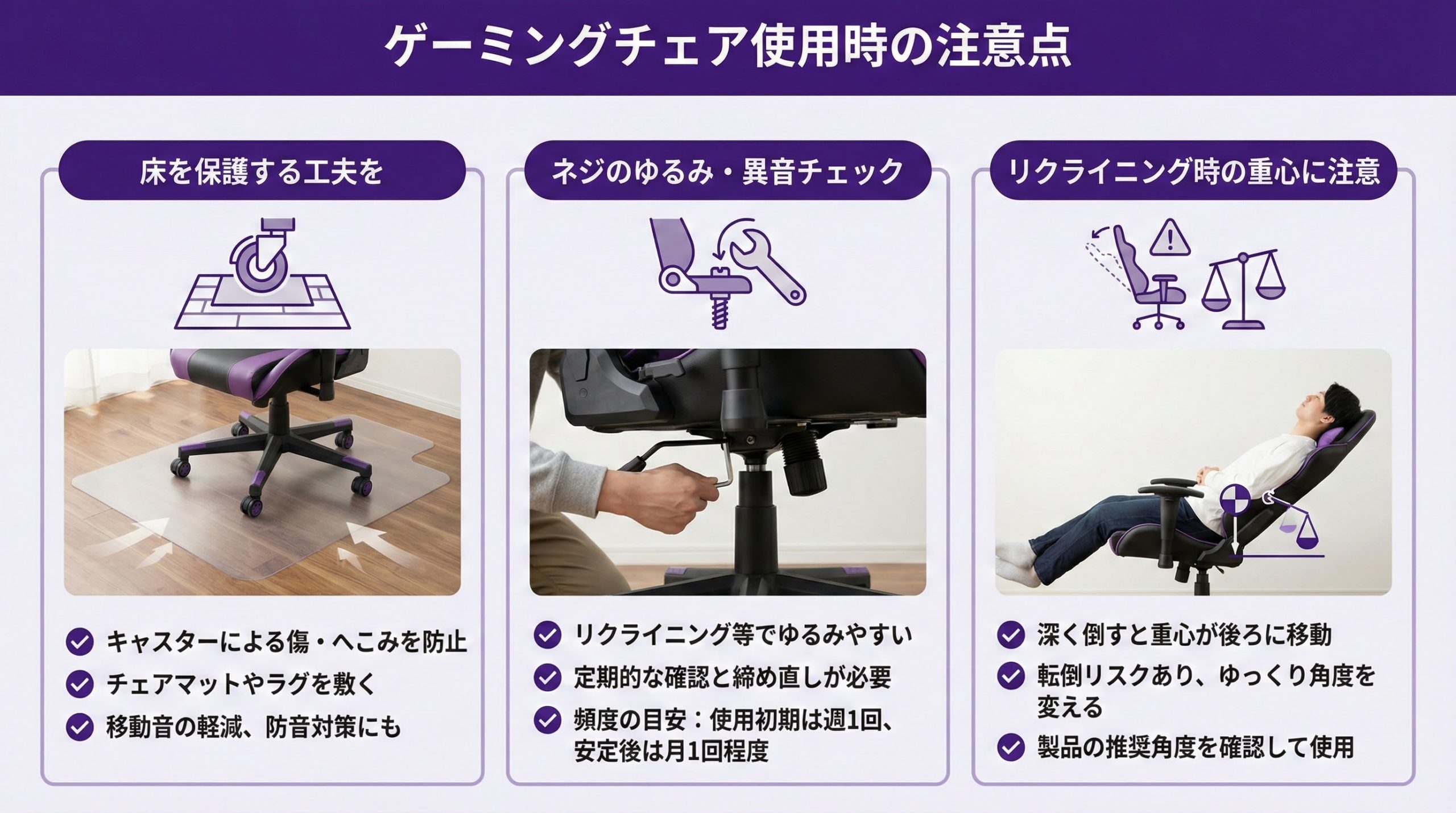 - ゲーミングチェア使用時の注意点