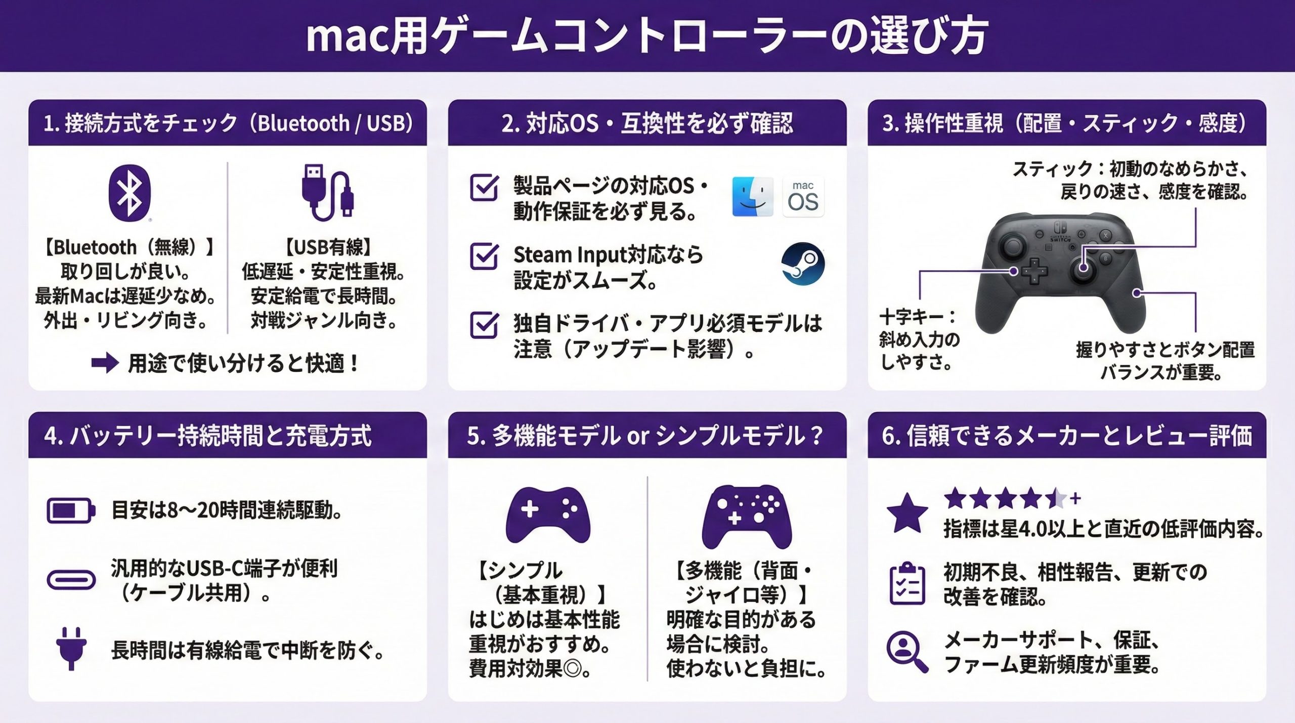 購入前に対応macOSの範囲をチェックしましょう。古いドライバ依存や独自アプリ必須のモデルはアップデートで挙動が変わる場合があります。Steam経由で遊ぶならSteam Input対応の有無を併せて確認すると安全です。