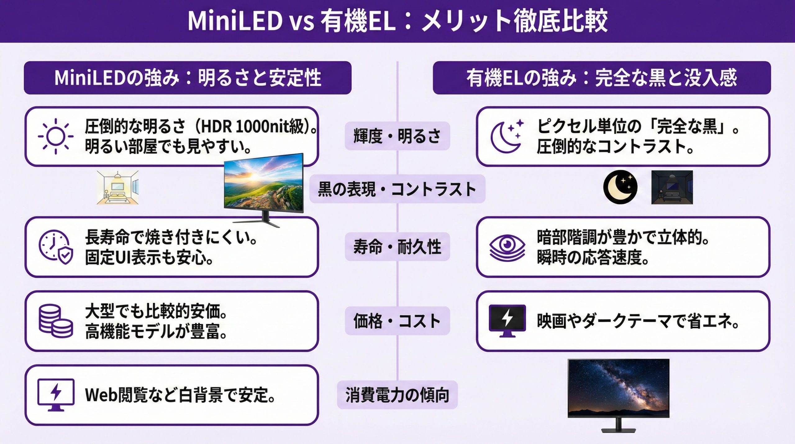 - 明るい部屋や日中視聴が多い→MiniLEDが見やすい