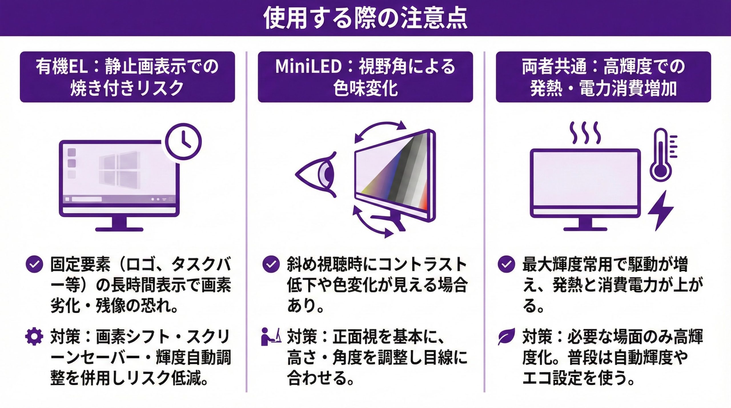 最大輝度を常用すると、MiniLEDはバックライト駆動が、有機ELは自発光素子の駆動が増え、どちらも発熱と消費電力が上がります。必要な場面のみ高輝度にし、普段は自動輝度やエコ設定を使うと快適性と寿命の両立に役立ちます。