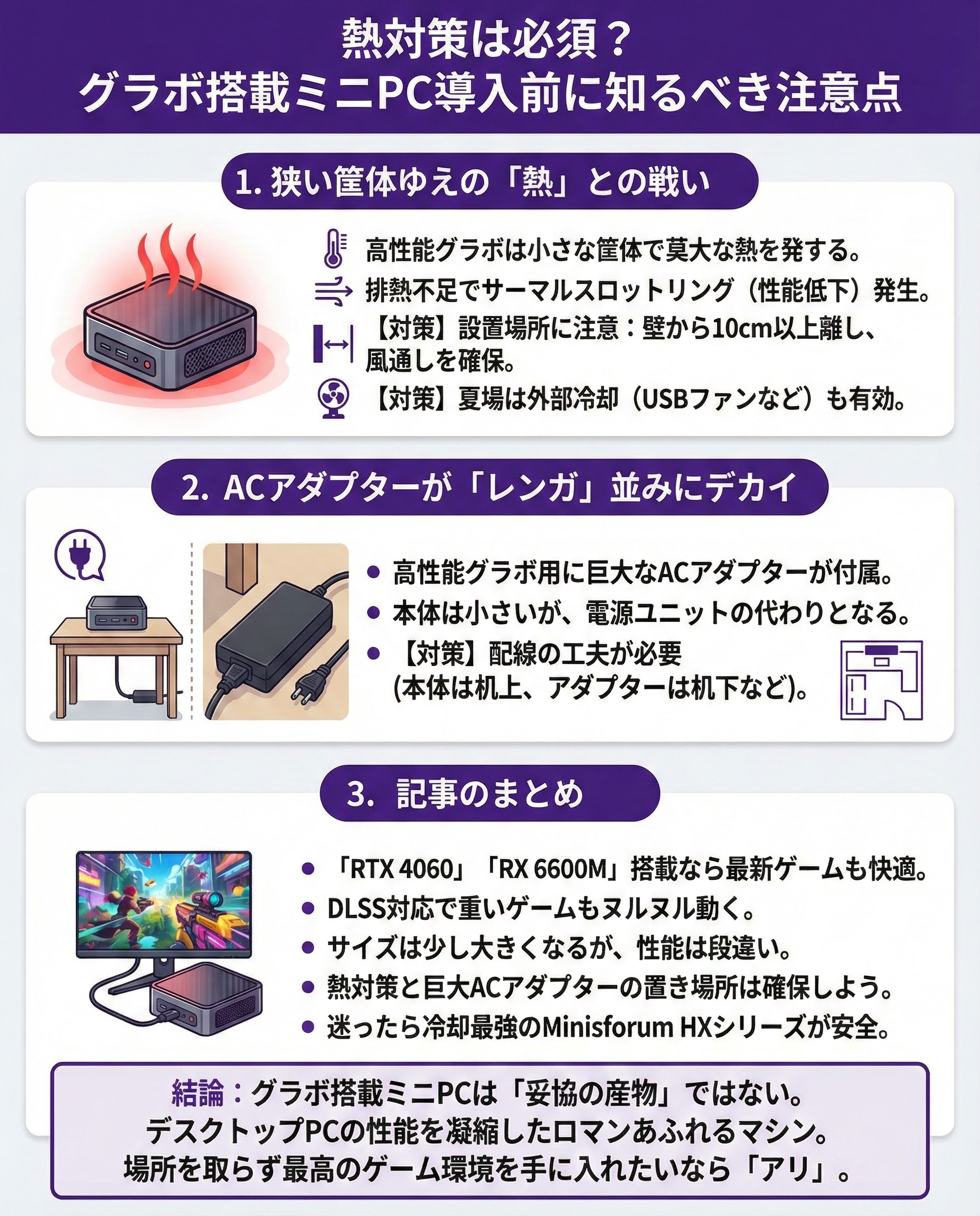 - 熱対策と巨大ACアダプターの置き場所は確保しよう