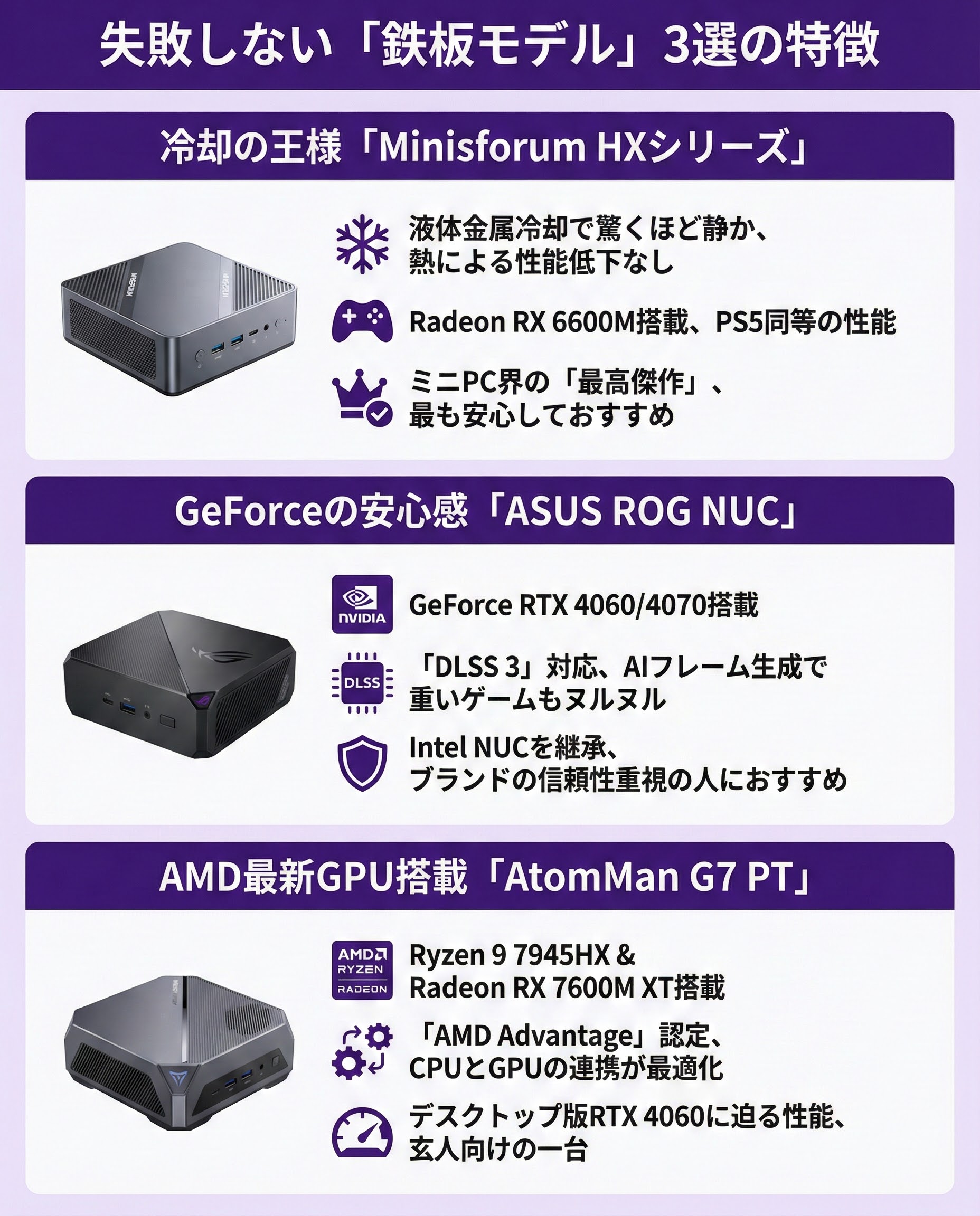 - 迷ったらまずはRTX 4060クラス(ROG NUCなど)を基準に選ぶと失敗しにくい