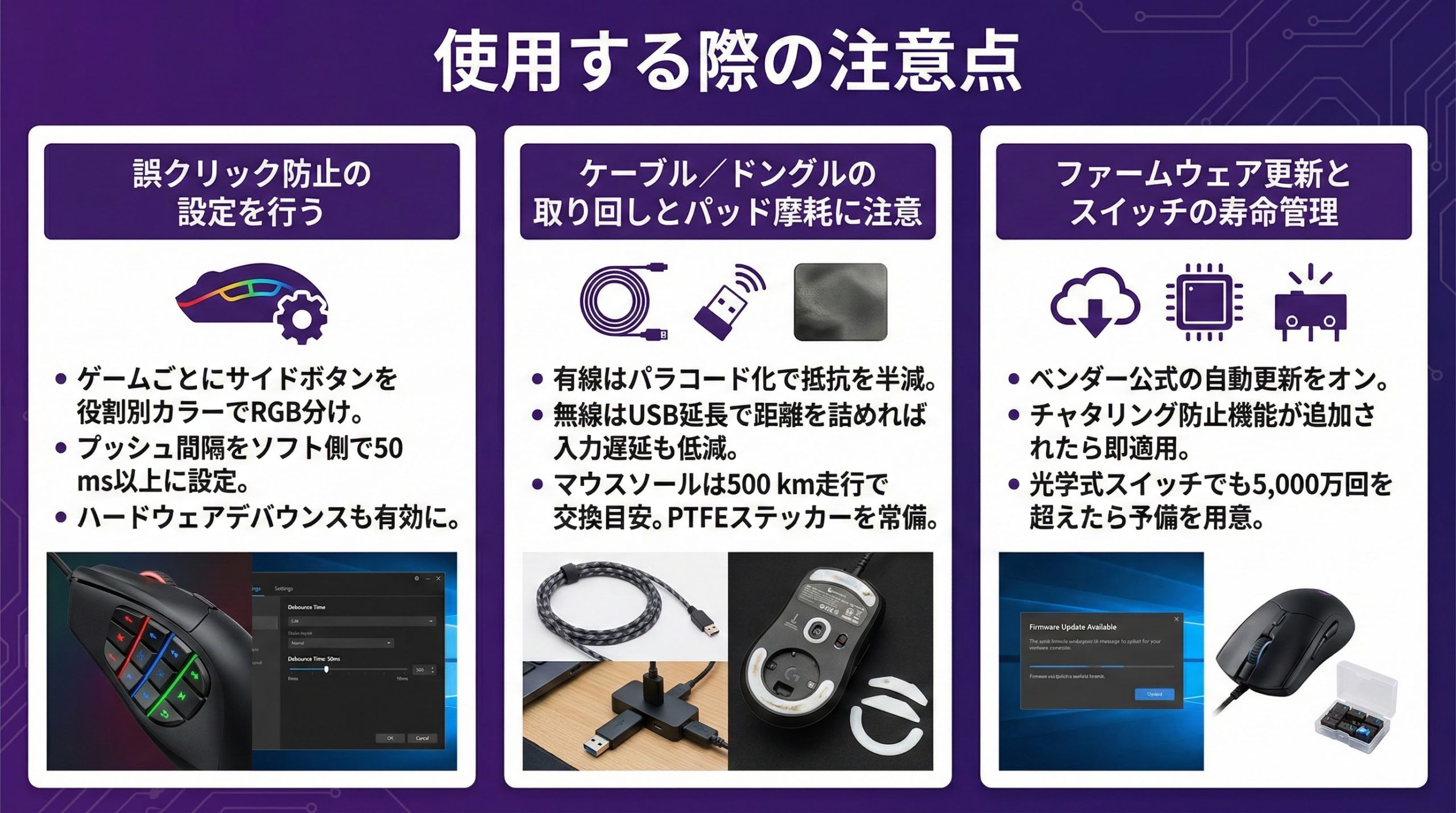 ベンダー公式の自動更新をオンにし、チャタリング防止機能が追加されたら即適用。光学式スイッチでも5,000万回を超えたら予備を用意し長期戦に備えましょう。