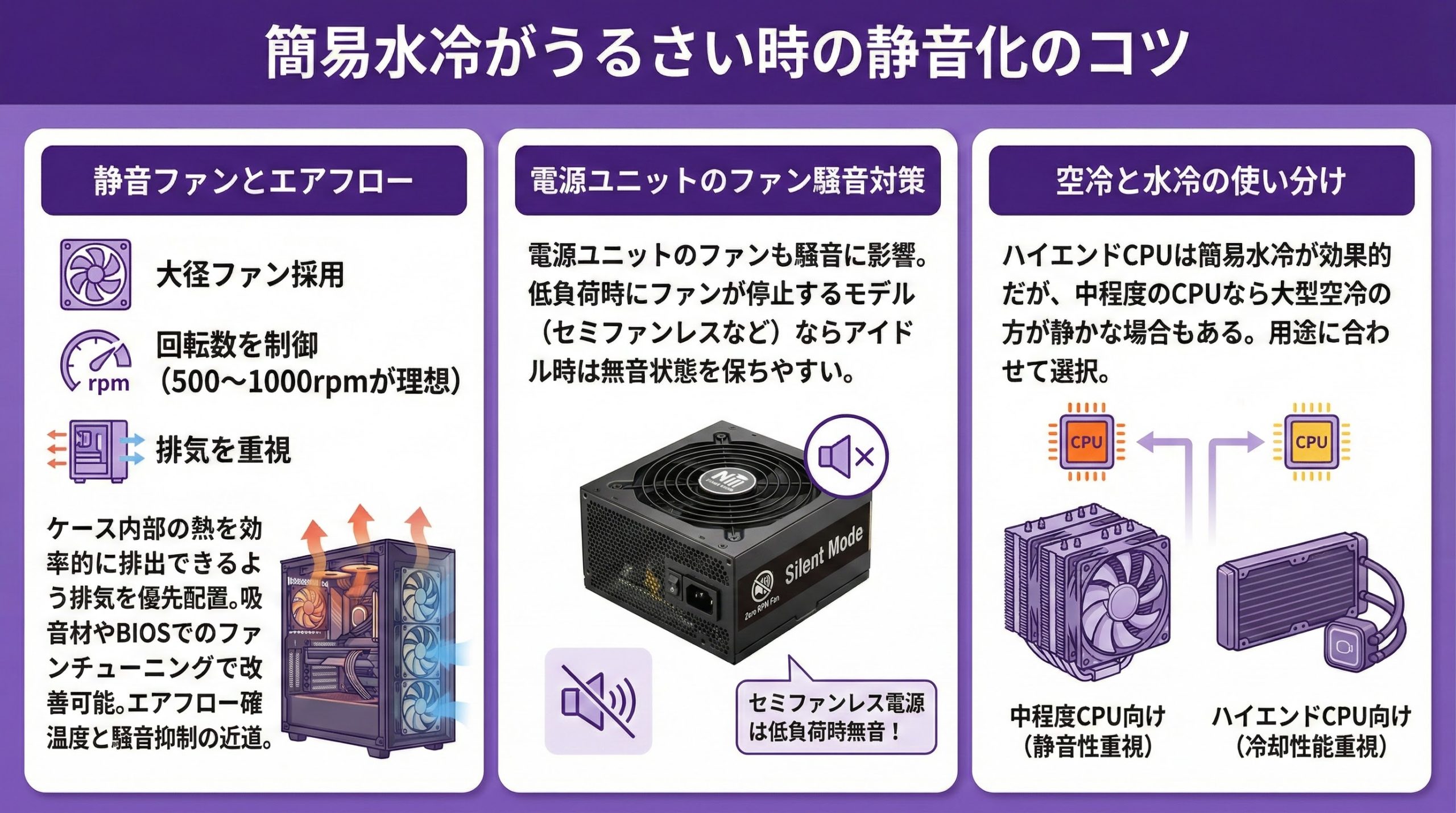 簡易水冷を静かに使うには、ファン制御やポンプの状態確認など地道な調整が重要です。