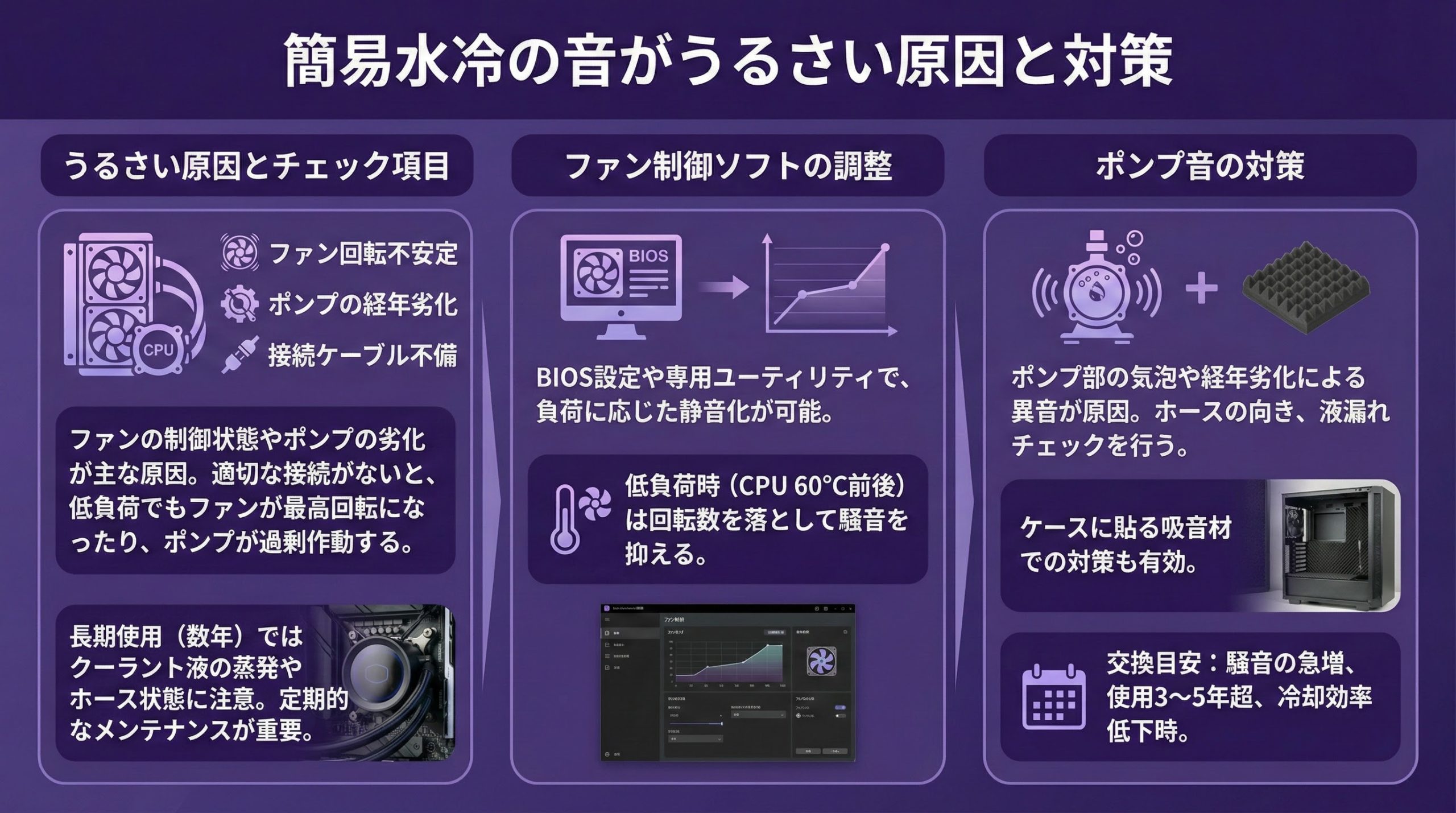 特に数年使用した簡易水冷ではクーラント液の蒸発やホースの状態にも注意が必要です。定期的なメンテナンスが音の軽減に大きく役立ちます。