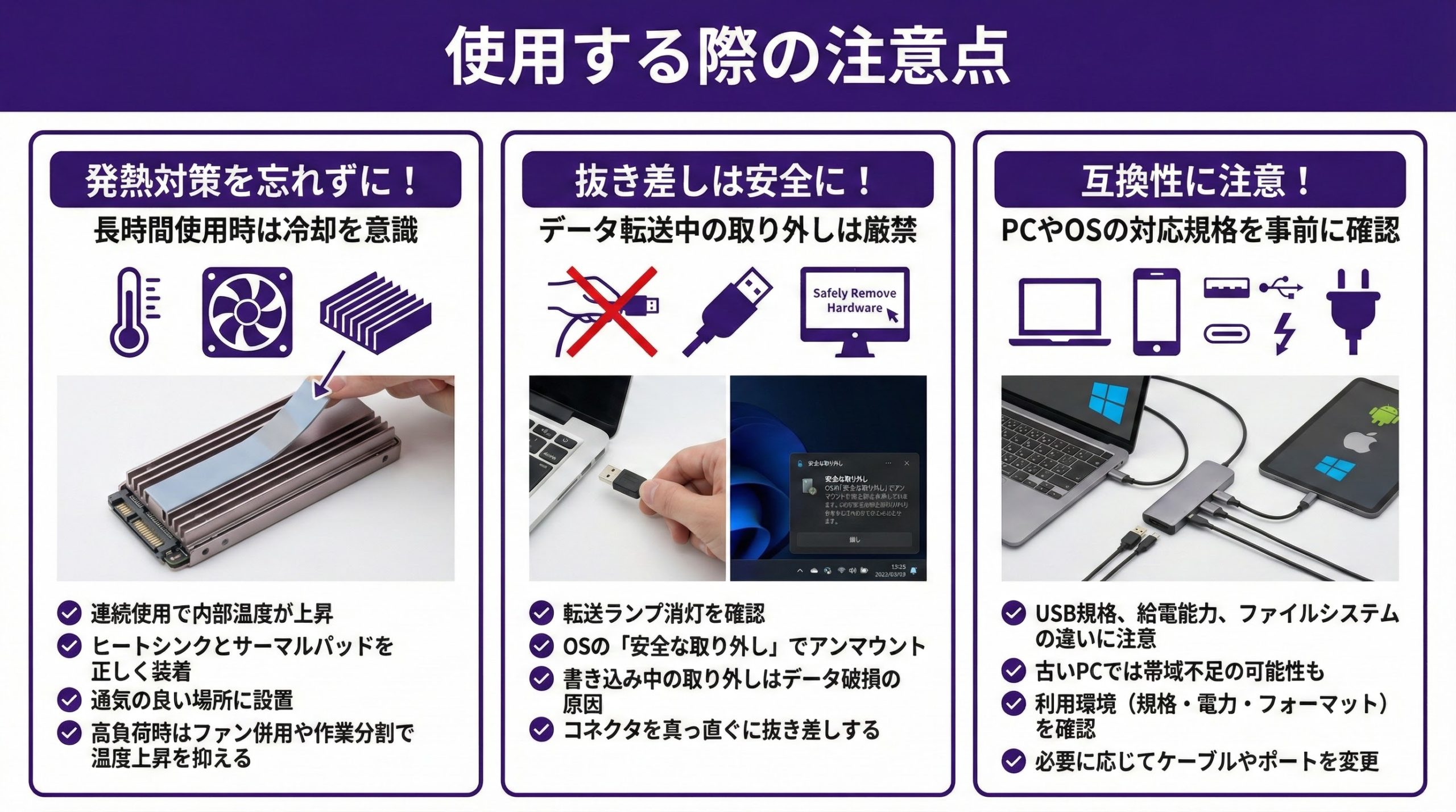 USB規格や給電能力、ファイルシステムの対応状況はOSや機器で異なります。古いPCでは帯域が不足する場合も。利用環境のUSB規格・電力供給・対応フォーマットを確認し、必要に応じてケーブルやポートを変更しましょう。