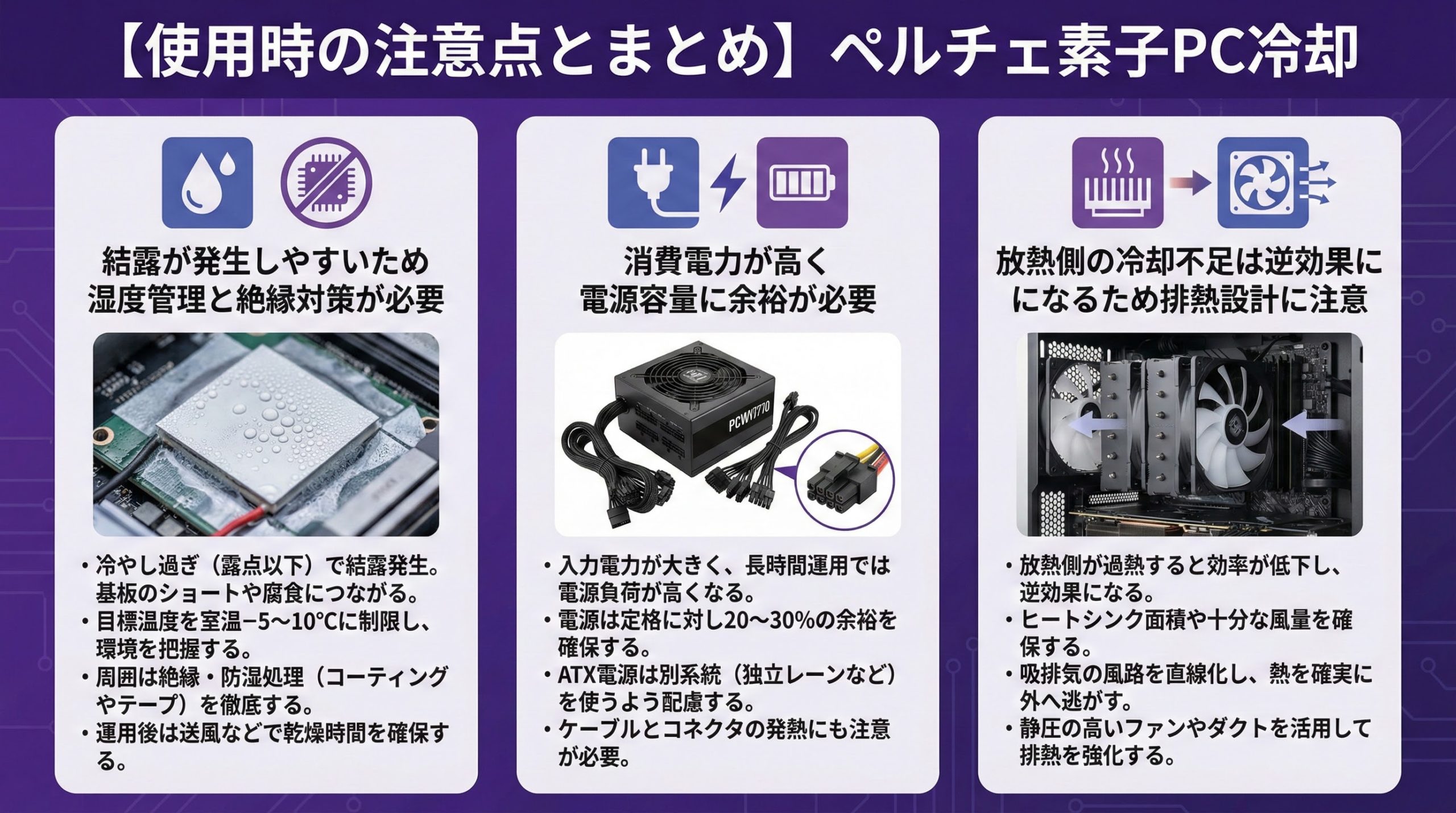 ペルチェ素子は入力電力が大きく、長時間運用では電源負荷が高くなります。USB給電はポートの定格を確認し、ATX電源は別系統を使うなど配慮が必要です。ケーブルとコネクタの発熱にも注意します。