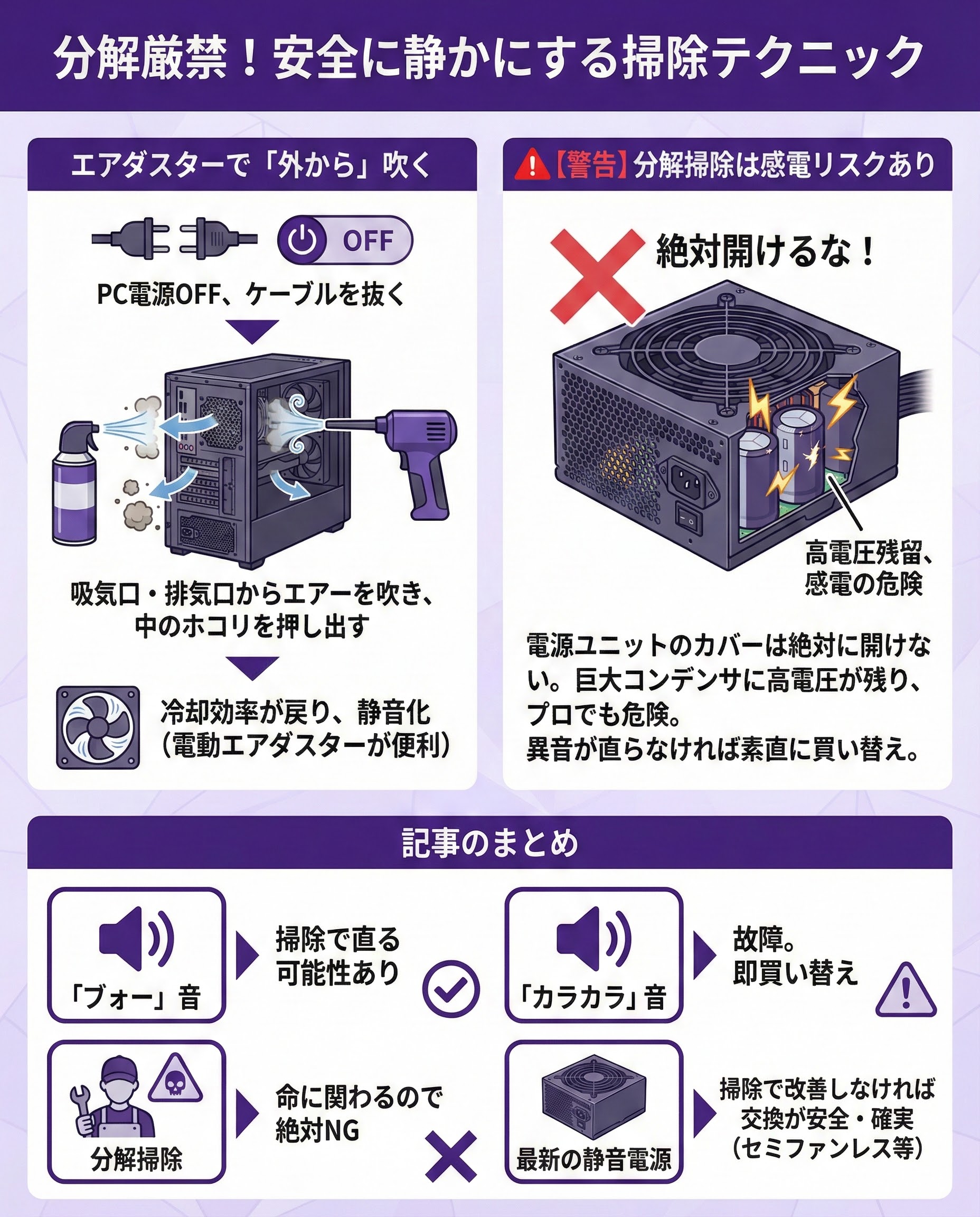 PCから聞こえる「ブォー」「カラカラ」という異音…それは電源ユニットのトラブルのサインです。電源は分解してファン交換ができない(感電リスクがある)ため、対処法を間違えると危険です。この記事では、異音の原因を音の種類で判別し、安全な掃除方法と、静音性に優れたおすすめ電源12選を紹介します。「爆発の前兆?」という不安を解消しましょう。