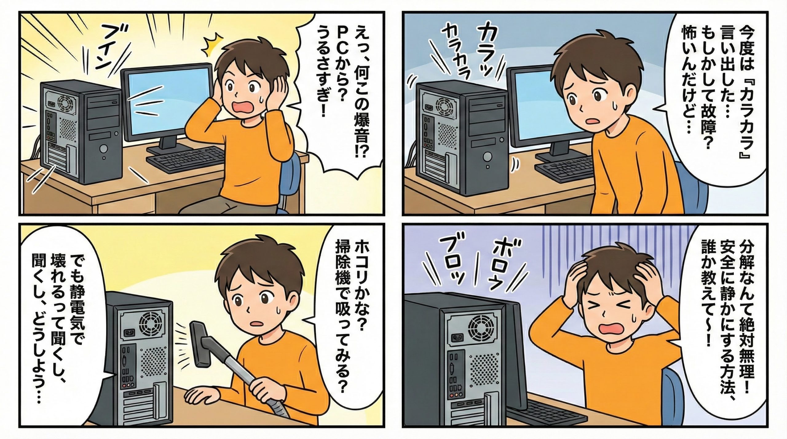 「キーン」「ジージー」という高周波音は「コイル鳴き」と呼ばれ、電気的な振動音です。故障ではありませんが、気になり出すと止まらない厄介な音です。負荷が高い時(ゲーム中など)に鳴りやすく、高品質な電源に交換することで収まる場合が多いです。
