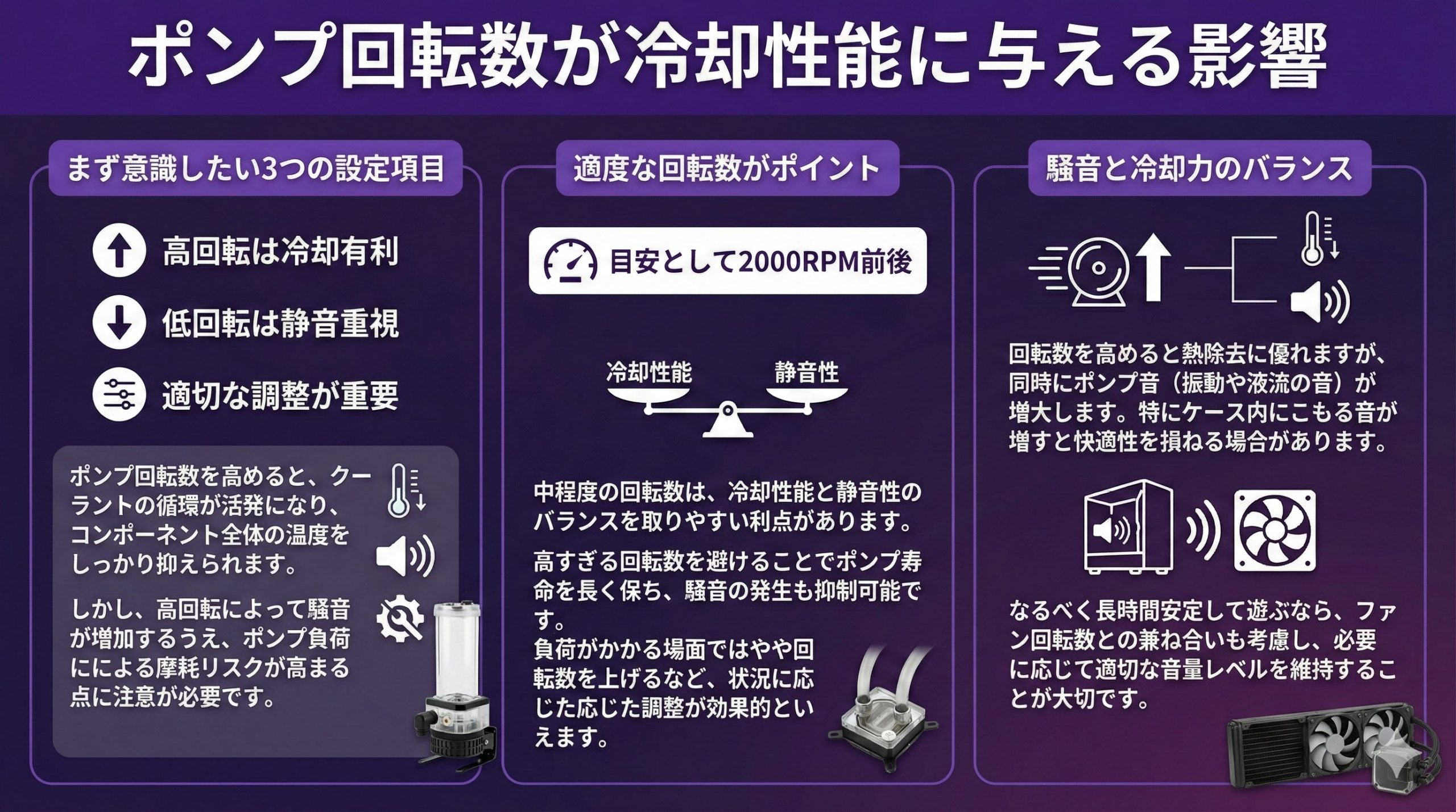 ポンプ回転数の設定は冷却力と静音性の両立に大きく影響します。適度な回転数を維持しつつ、使用環境や負荷状況に合わせて微調整を行うのが理想です。