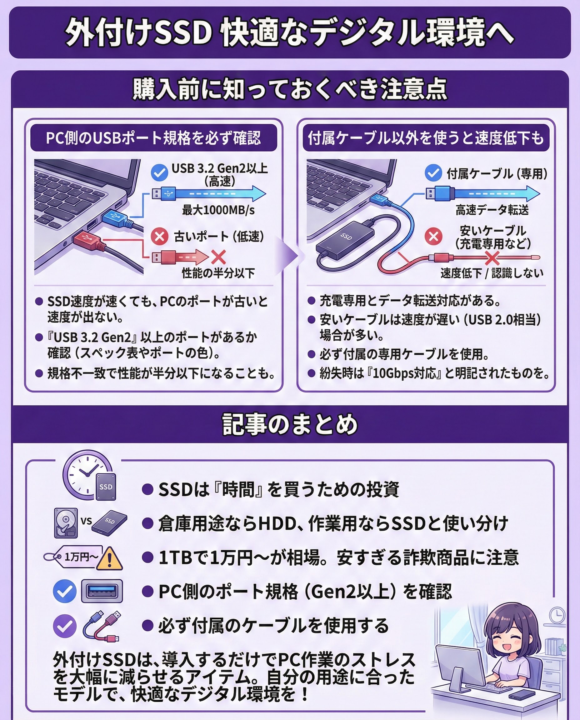 外付けSSDは、導入するだけでPC作業のストレスを大幅に減らせるアイテムです。メリット・デメリットを正しく理解し、自分の用途に合った容量と速度のモデルを選んで、快適なデジタル環境を手に入れましょう。