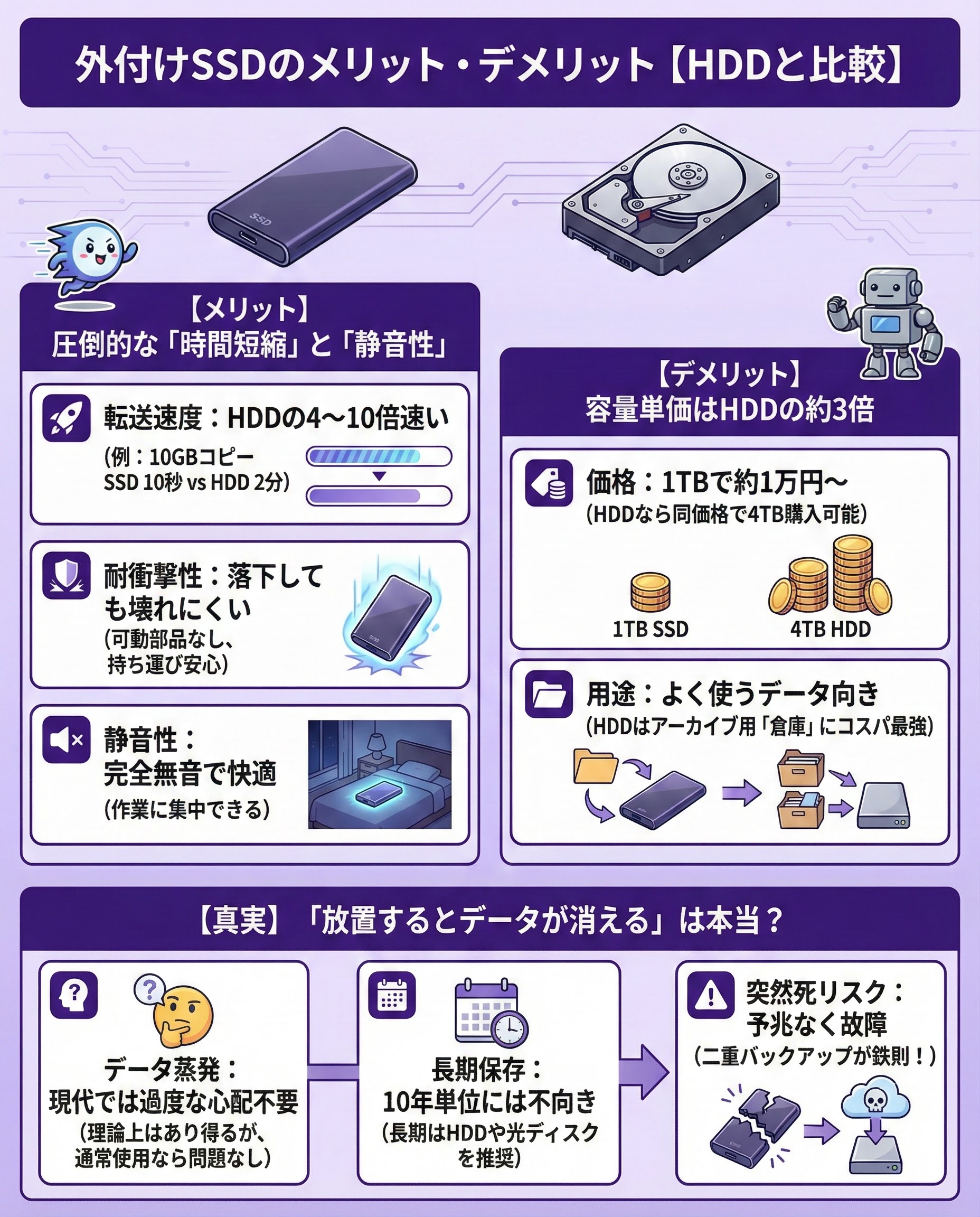 SSD最大の武器は速度です。10GBの動画コピーならHDDは2分かかりますが、SSDなら10秒で終わります。この「待ち時間の消失」こそが価格差の価値です。また、可動部品がないため衝撃に強く、持ち運び時の故障リスクが劇的に低いのも特徴です。