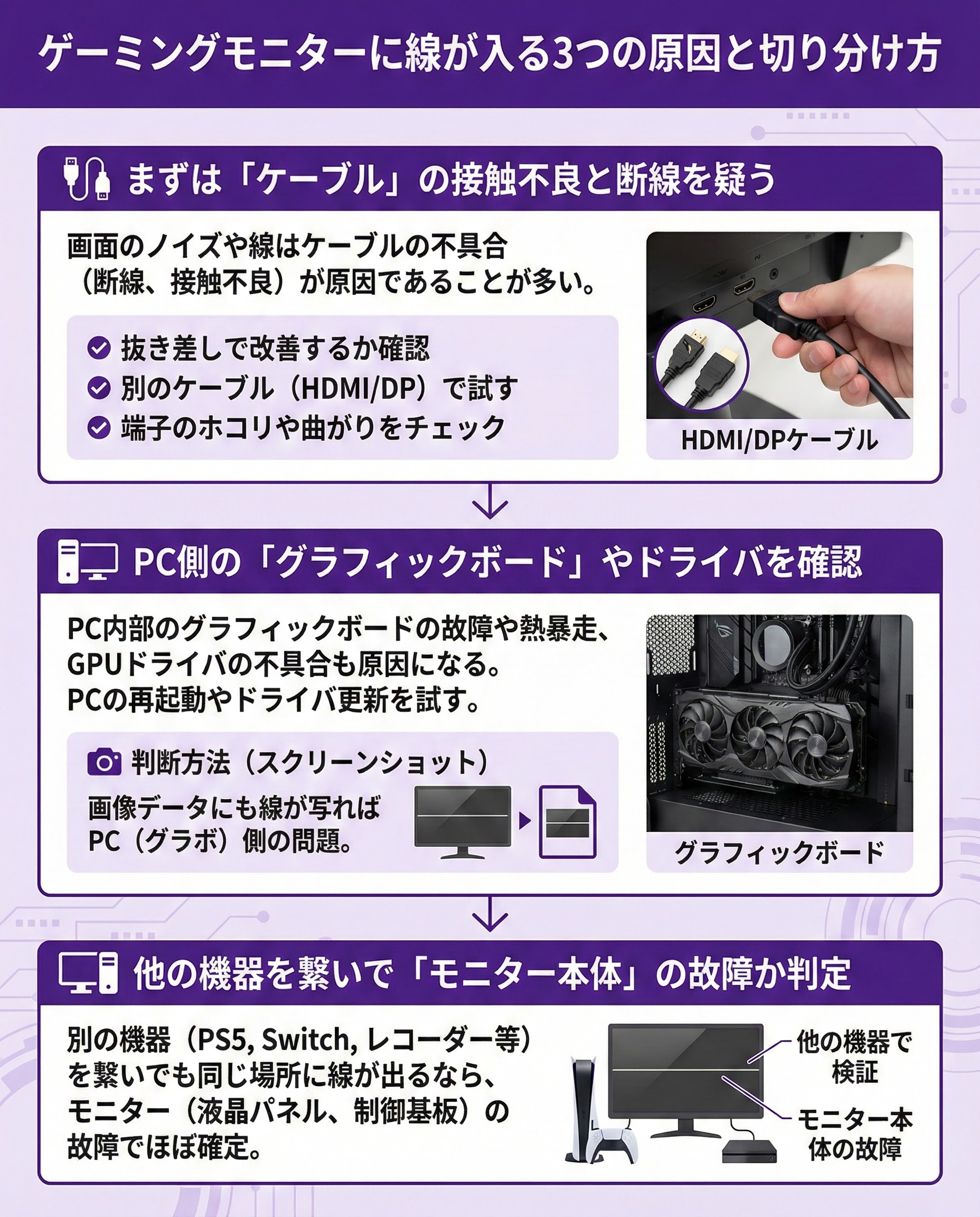 ゲーミングモニターに線が入る3つの原因と切り分け方