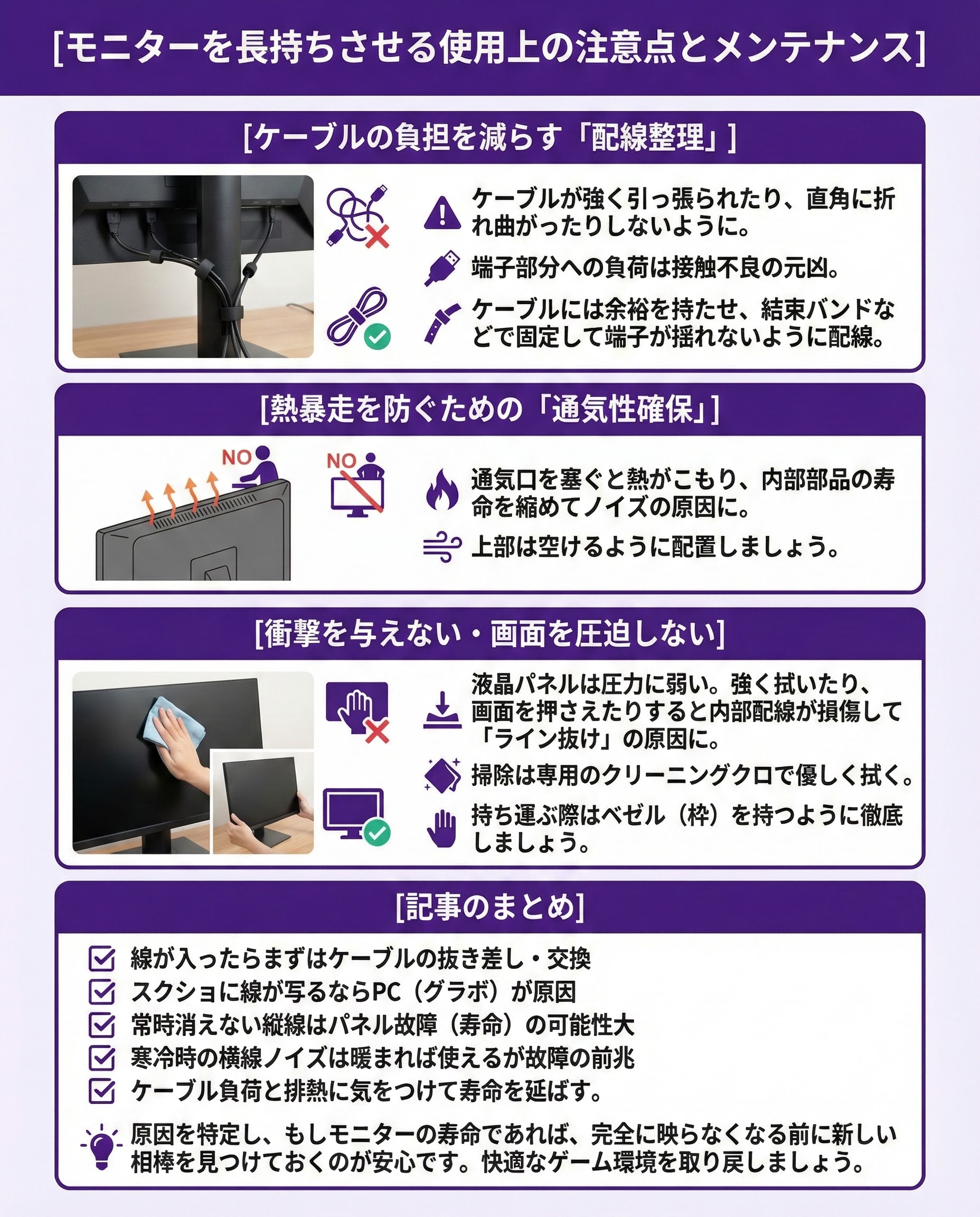 モニターを長持ちさせる使用上の注意点とメンテナンスケーブルの負担を減らす「配線整理」