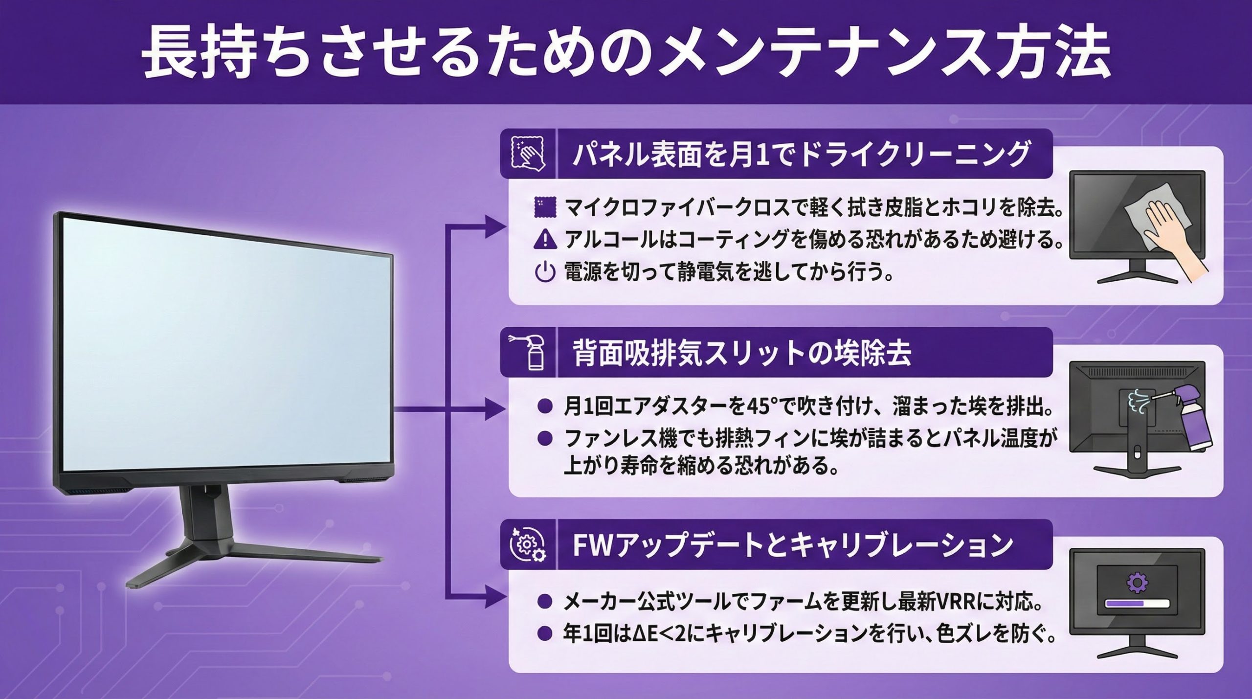 メーカー公式ツールでファームを更新し最新VRRに対応。年1回はΔE<2にキャリブレーションを行い、映像制作でも色ズレを防ぎましょう。