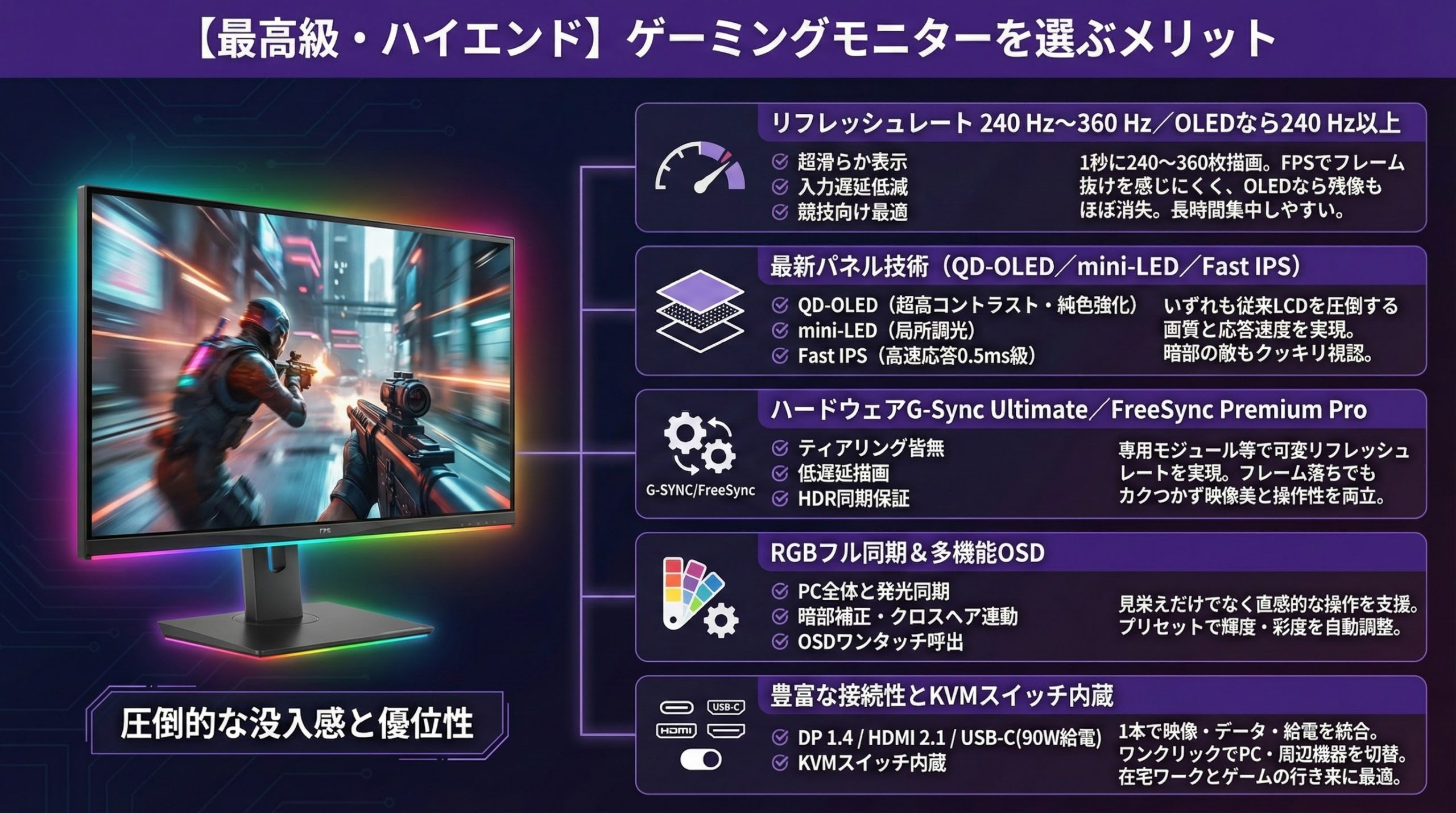 【最高級・ハイエンド】ゲーミングモニターを選ぶメリットリフレッシュレート 240 Hz~360 Hz/OLEDなら240 Hz以上