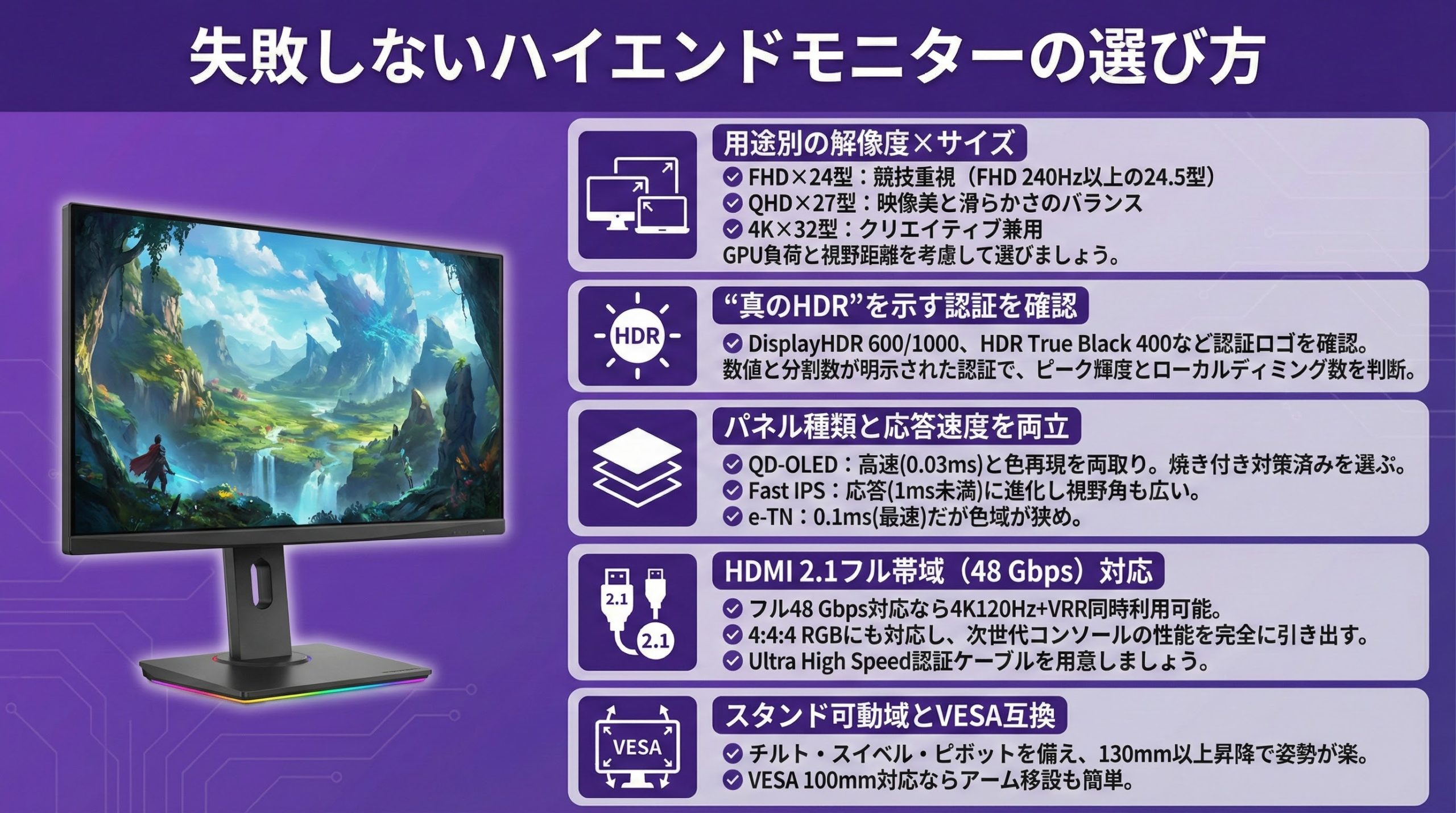 映画もゲームも両立したいならQD-OLED。HDRピークを重視するならmini-LED、コスパ重視ならFast IPSがおすすめです。