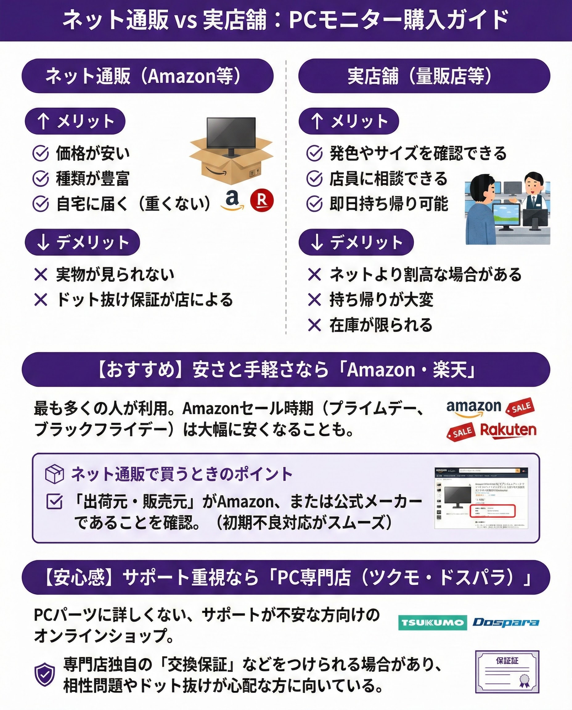 結論から言うと、品揃えと価格を重視するなら「ネット通販(Amazonや専門店)」、実物を見てドット抜け保証などを手厚くしたいなら「実店舗」がおすすめです。