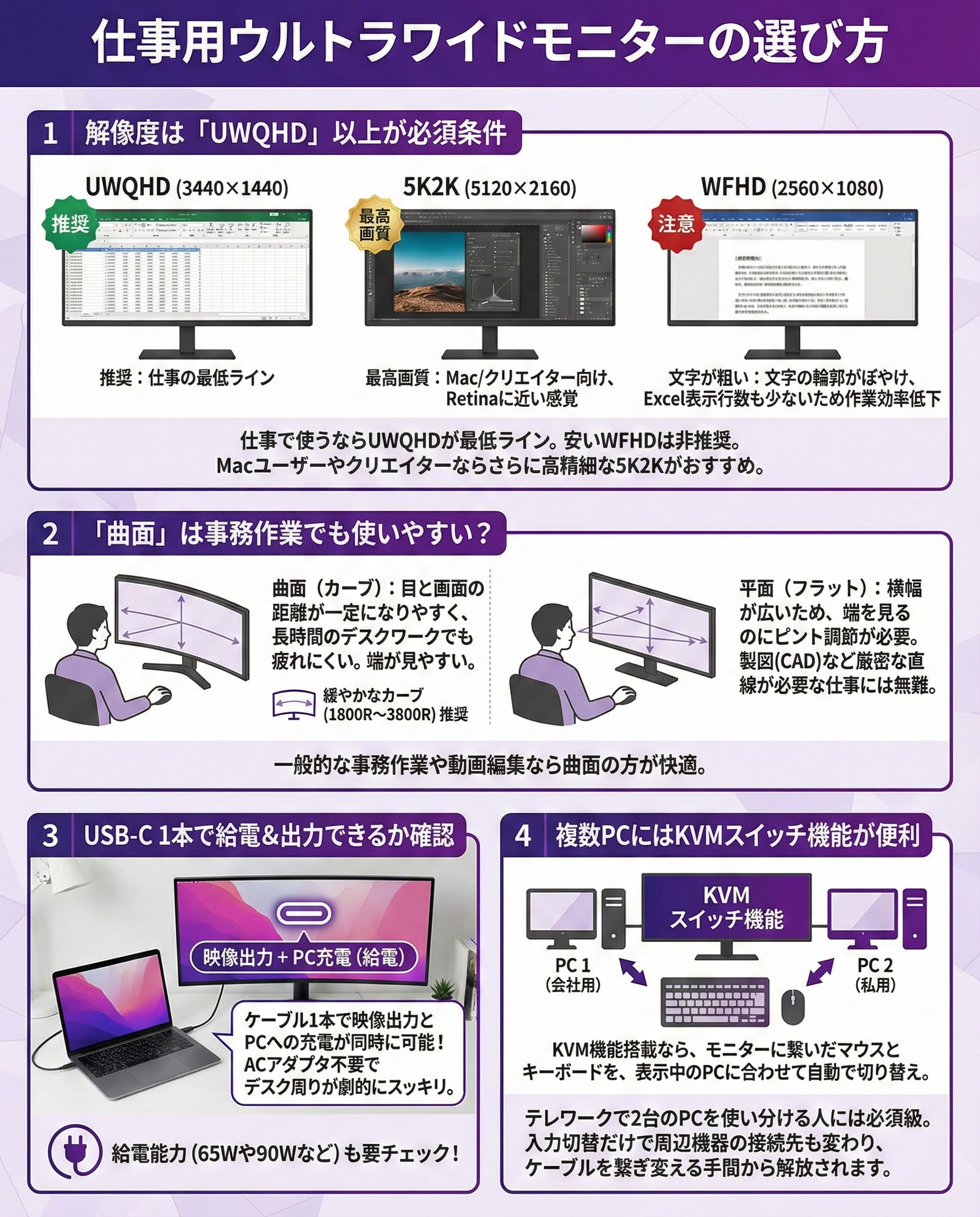 仕事で使うなら、解像度はUWQHD(3440×1440)が最低ラインです。安いWFHD(2560×1080)は文字の輪郭がぼやけやすく、Excelの表示行数も少ないため作業効率が落ちます。Macユーザーやクリエイターなら、さらに高精細な5K2Kモデルを選ぶとRetinaに近い感覚で使えます。
