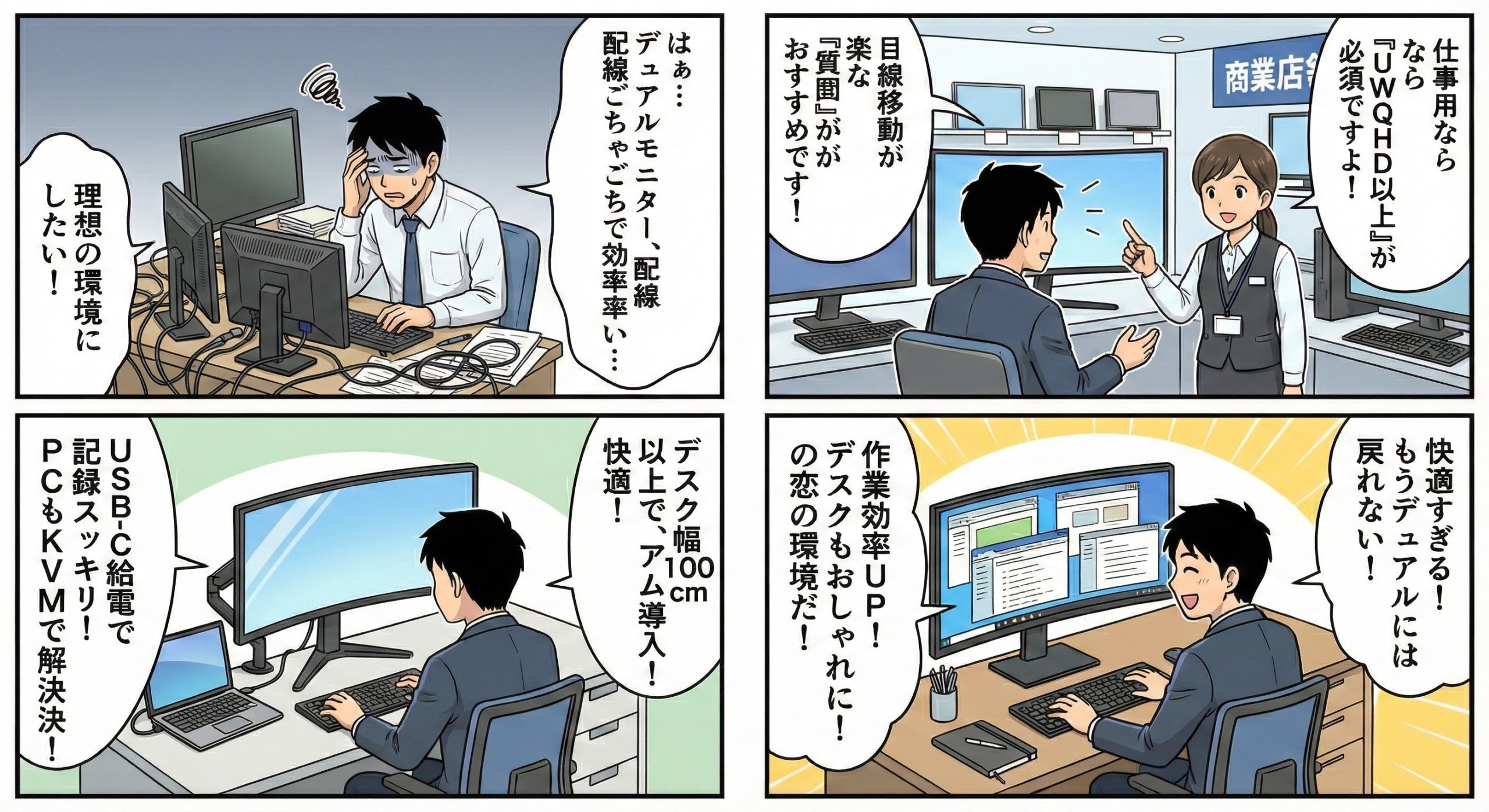 ウルトラワイドモニターは、一度使うと「もうデュアルモニターには戻れない」と感じるほど快適です。作業効率が上がるだけでなく、配線もスッキリしてデスクがおしゃれになる。そんな理想の環境を、ぜひ手に入れてください。