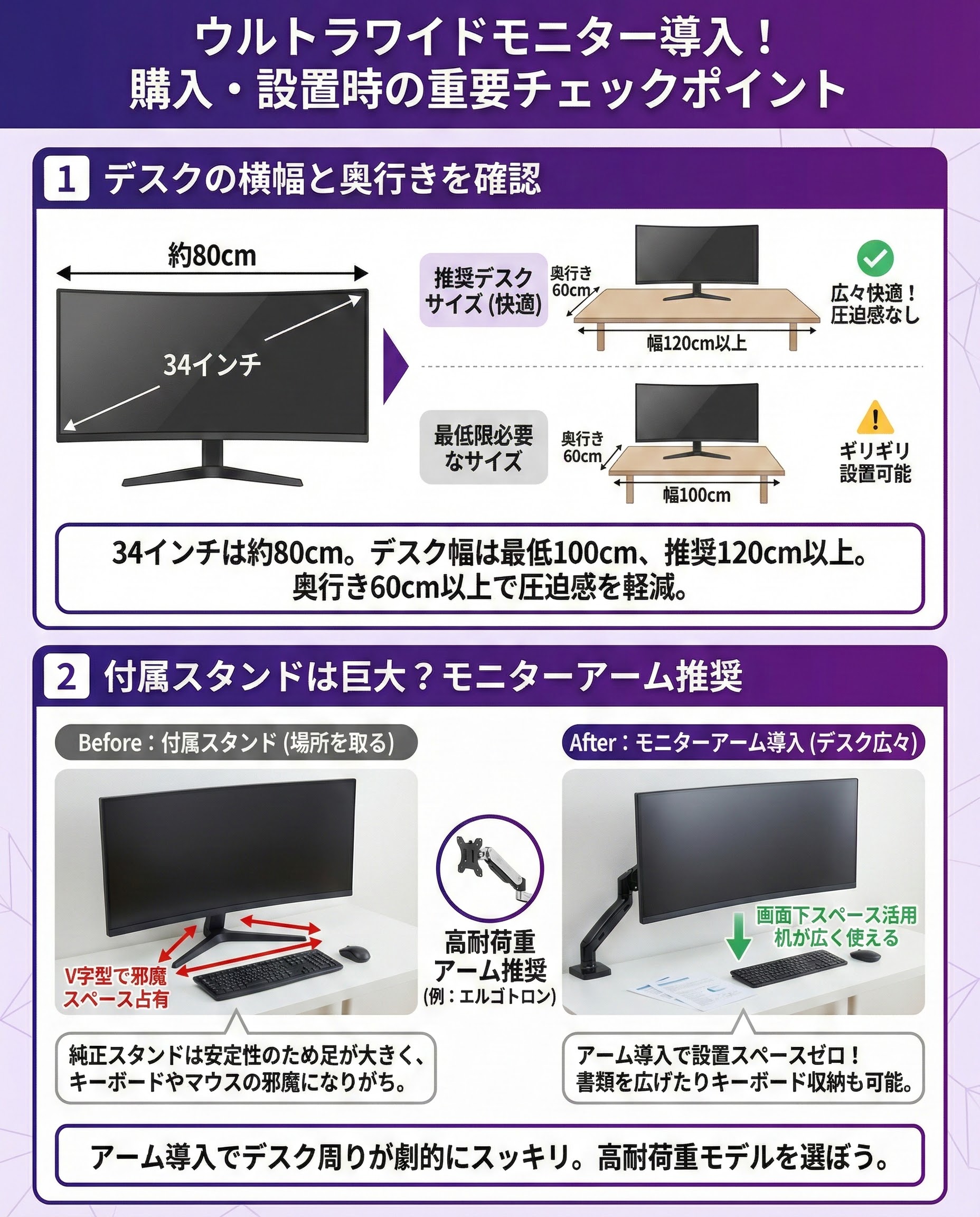 34インチウルトラワイドは横幅が約80cmあります。デスクの幅は最低でも100cm、できれば120cm以上あると安心です。また、画面が大きいぶん圧迫感が出やすいので、奥行き60cm以上のデスクでの使用を強くおすすめします。